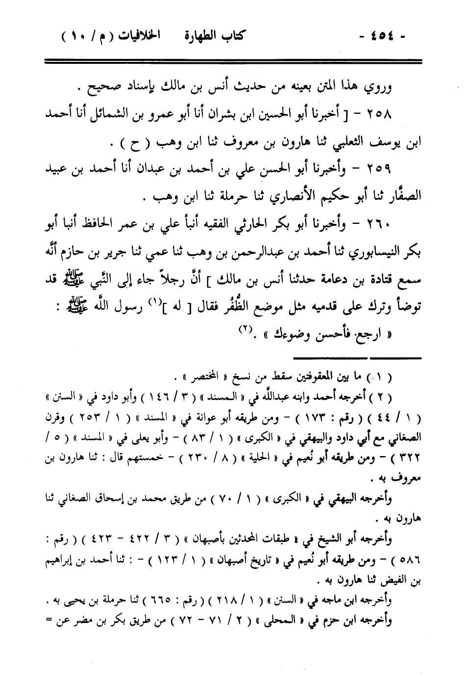 260- وأخبرنا أبو بكر الحارثي الفقيه أنبأ علي بن عمر الحافظ أنبأ أبو بكر النيسابوري ثنا أحمد بن عبد الرحمن بن وهب ثنا عمي ثنا جرير بن حازم أنه سمع قتادة بن دعامة حدثنا أنس بن مالك] أن رجلاً جاء إلى النبي صلى الله عليه وسلم قد توضأ وترك على قدميه مثل موضع الظفر فقال [له] رسول الله صلى الله عليه وسلم :