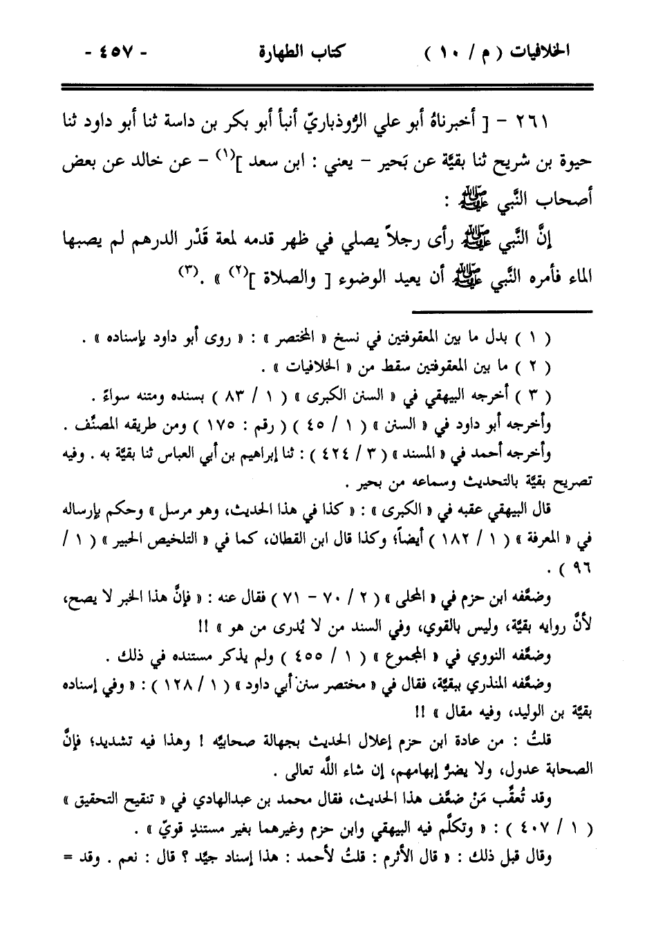 إن النبي صلى الله عليه وسلم رأى رجلاً يصلي في ظهر قدمه لمعة قدر الدرهم لم يصبها الماء فأمره النبي صلى الله عليه وسلم أن يعيد الوضوء [والصلاة])).