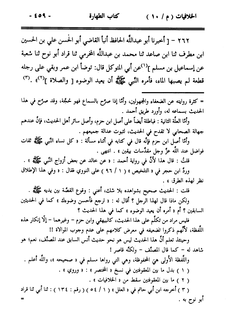 262- [أخبرنا أبو عبد الله الحافظ أنبأ القاضي أبو الحسن علي بن الحسين ابن مطرف ثنا ابن صاعد ثنا محمد بن عبد الله المخرمي ثنا قراد أبو نوح ثنا شعبة عن إسماعيل بن مسلم] عن أبي المتوكل قال: توضأ ابن عمر وبقي على رجله قطعة لم يصبها الماء، فأمره النبي صلى الله عليه وسلم أن يعيد الوضوء [والصلاة])).