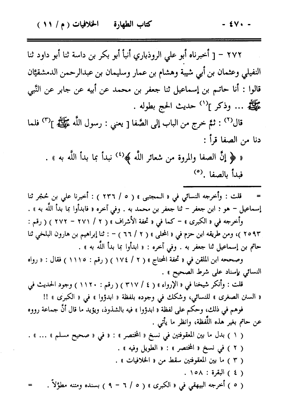 272- [أخبرناه أبو علي الروذباري أنبأ أبو بكر بن داسة ثنا أبو دود ثنا النفيلي وعثمان بن أبي شيبة وهشام بن عمار وسليمان بن عبد الرحمن الدمشقيان قالوا: أنا حاتم بن إسماعيل ثنا جعفر بن محمد عن أبيه عن جابر عن النبي صلى الله عليه وسلم .. .. وذكر] حديث الحج بطوله.