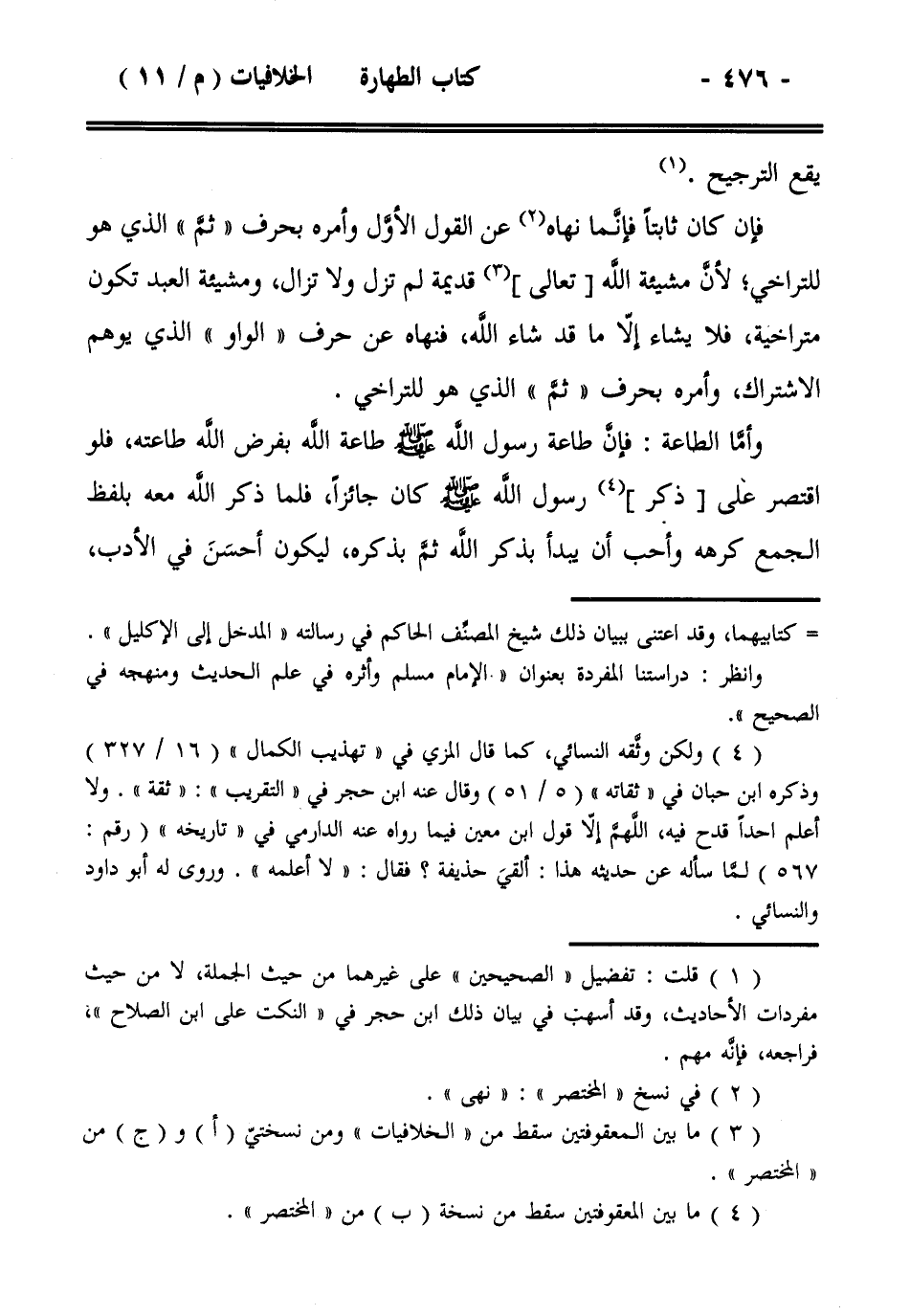 فإن كان ثابتاً فإنما نهاه عن القول الأول وأمره بحرف ((ثم)) الذي هو للتراخي؛ لأن مشيئة الله [تعالى] قديمة لم تزل ولا تزال، ومشيئة العبد تكون متراخية، فلا يشاء إلا ما قد شاء الله، فنهاه عن حرف ((الواو)) الذي يوهم الاشتراك، وأمره بحرف ((ثم)) الذي هو للتراخي.