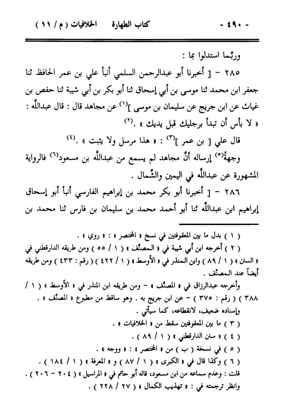 285- [أخبرنا أبو عبد الرحمن السلمي أنبأ علي بن عمر الحافظ ثنا جعفر ابن محمد ثنا موسى بن أبي إسحاق ثنا أبو بكر بن أبي شيبة ثنا حفص بن غياث عن ابن جريج عن سليمان بن موسى] عن مجاهد قال: قال عبد الله: ((لا بأس أن تبدأ برجليك قبل يديك)).