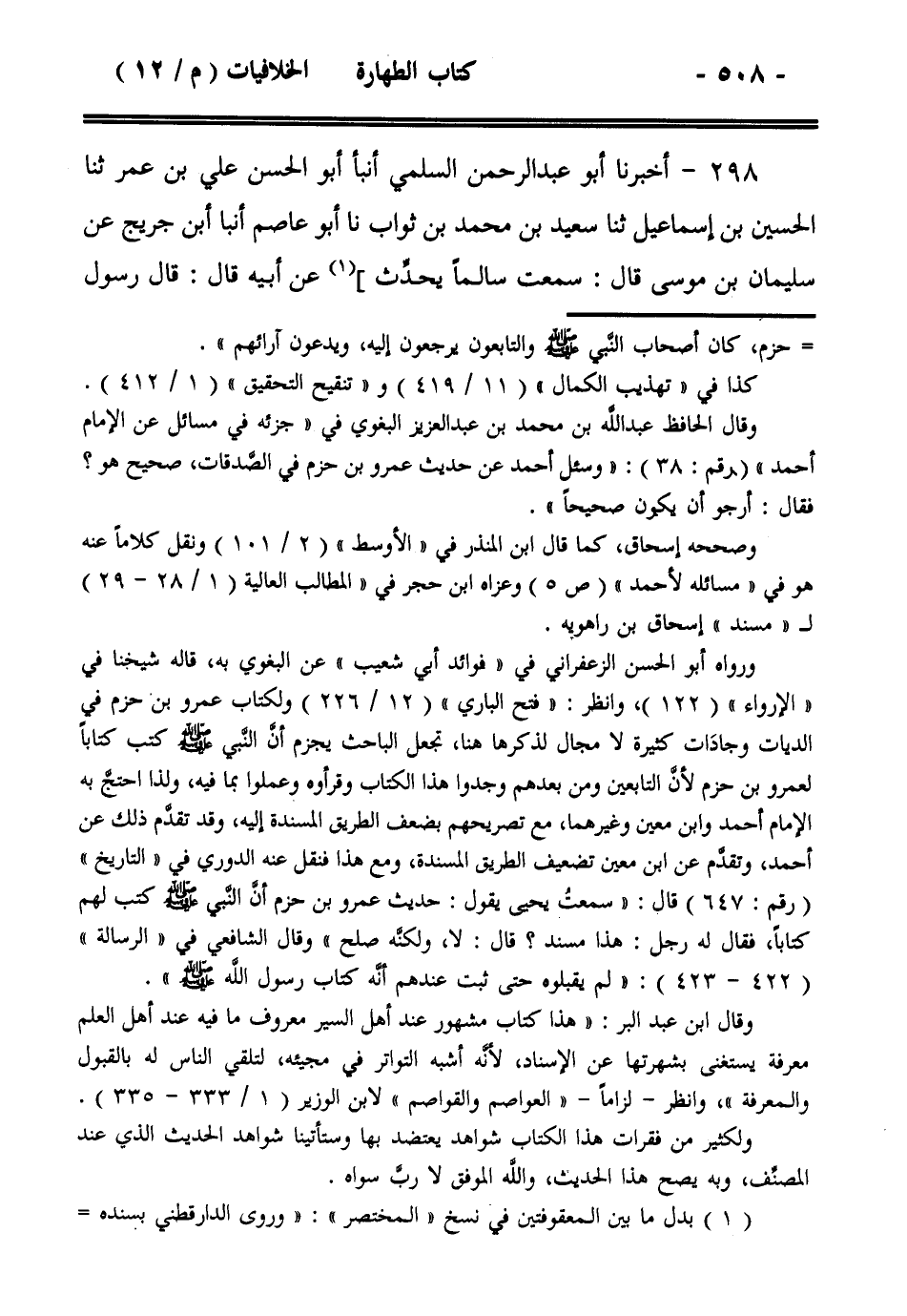 298- أخبرنا أبو عبد الرحمن السلمي أنبأ أبو الحسن علي بن عمر ثنا الحسين بن إسماعيل ثنا سعيد بن محمد بن ثواب نا أبو عاصم أنبأ ابن جريج عن سليمان بن موسى قال: سمعت سالماً يحدث] عن أبيه قال: قال رسول