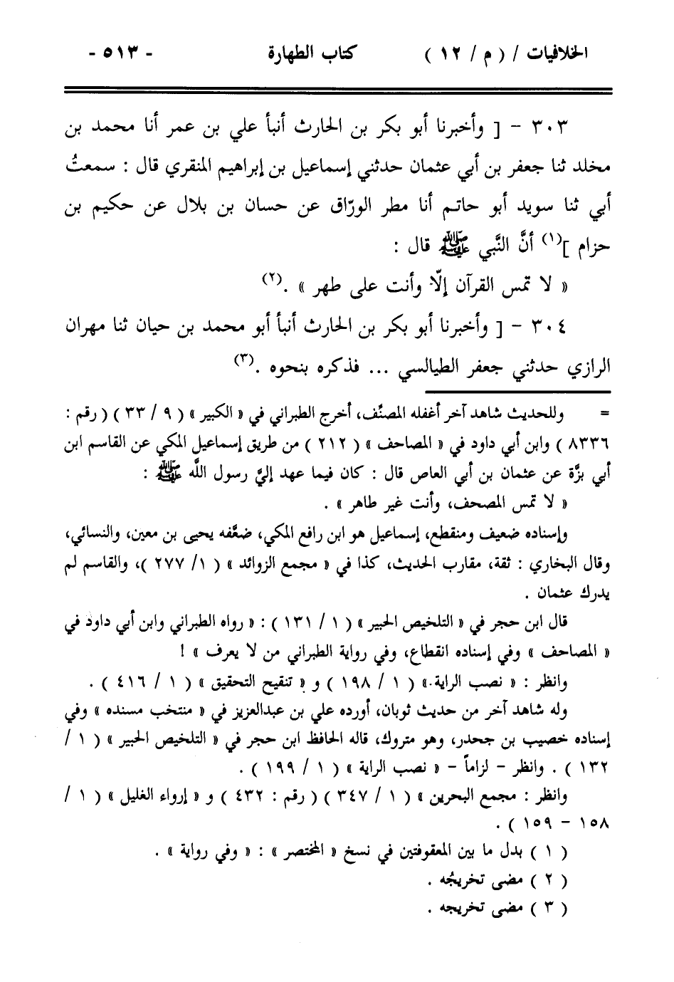303- [وأخبرنا أبو بكر بن الحارث أنبأ علي بن عمر أنا محمد بن مخلد ثنا جعفر بن أبي عثمان حدثني إسماعيل بن إبراهيم المنقري قال: سمعت أبي ثنا سويد أبو حاتم أنا مطر الوراق عن حسان بن بلال عن حكيم بن حزام] أن النبي صلى الله عليه وسلم قال: