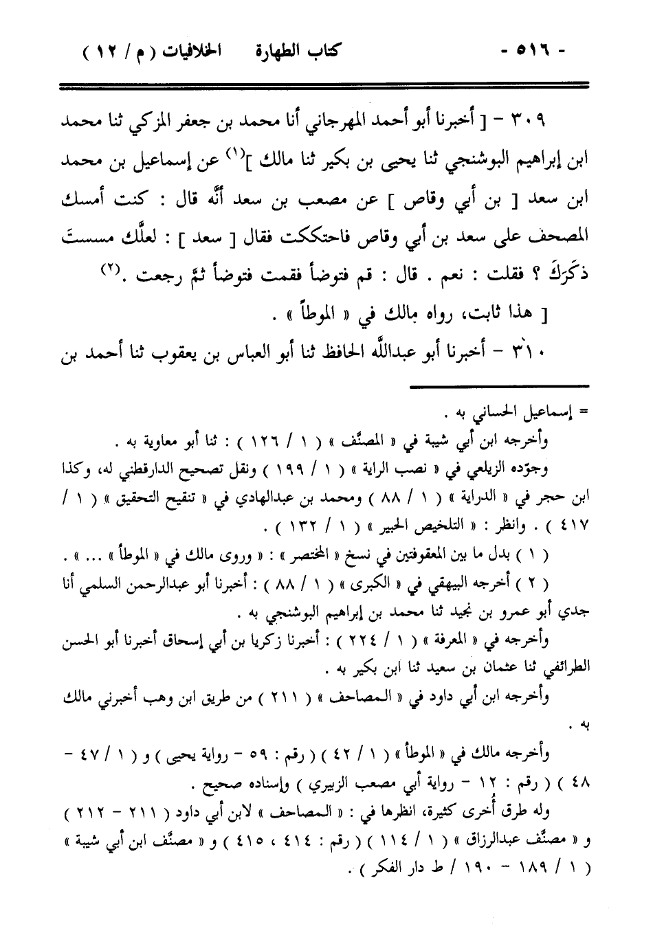 309- [أخبرنا أبو أحمد المهرجاني أنا محمد بن جعفر المزكي ثنا محمد ابن إبراهيم البوشنجي ثنا يحيى بن بكير ثنا مالك] عن إسماعيل بن محمد ابن سعد [بن أبي وقاص] عن مصعب بن سعد أنه قال: كنت أمسك المصحف على سعد بن أبي وقاص فاحتككت فقال [سعد]: لعلك مسست ذكرك؟ فقلت: نعم. قال: قم فتوضأ فقمت فتوضأ ثم رجعت.