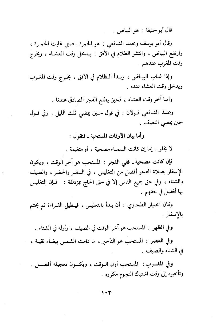 وَأما بَيَان الْأَوْقَات المستحبة فَنَقُول لَا يَخْلُو إِمَّا إِن كَانَت السَّمَاء مصحية أَو متغيمة فَإِن كَانَت مصحية فَفِي الْفجْر الْمُسْتَحبّ هُوَ آخر الْوَقْت وَيكون الْإِسْفَار بِصَلَاة الْفجْر أفضل من التغليس فِي السّفر والحضر والصيف والشتاء وَفِي حق جَمِيع النَّاس إِلَّا فِي حق الْحَاج بِمُزْدَلِفَة فَإِن التغليس بهَا أفضل فِي حَقهم