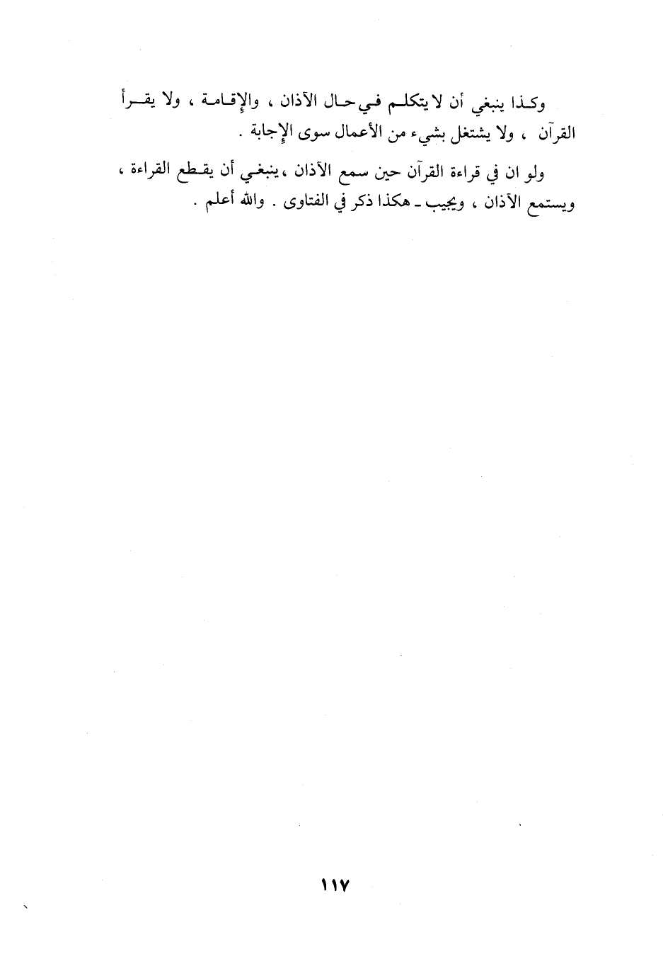 وَكَذَا يَنْبَغِي أَن لَا يتَكَلَّم فِي حَال الْأَذَان وَالْإِقَامَة وَلَا يقْرَأ الْقُرْآن وَلَا يشْتَغل بِشَيْء من الْأَعْمَال سوى الْإِجَابَة