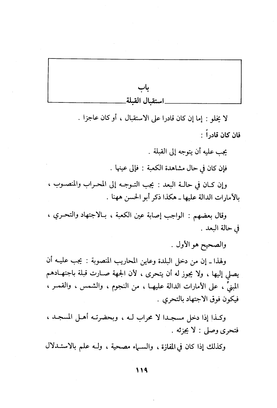 وَإِن كَانَ فِي حَالَة الْبعد يجب التَّوَجُّه إِلَى الْمِحْرَاب والمنصوب بالأمارات الدَّالَّة عَلَيْهَا هَكَذَا ذكر أَبُو الْحسن هَهُنَا