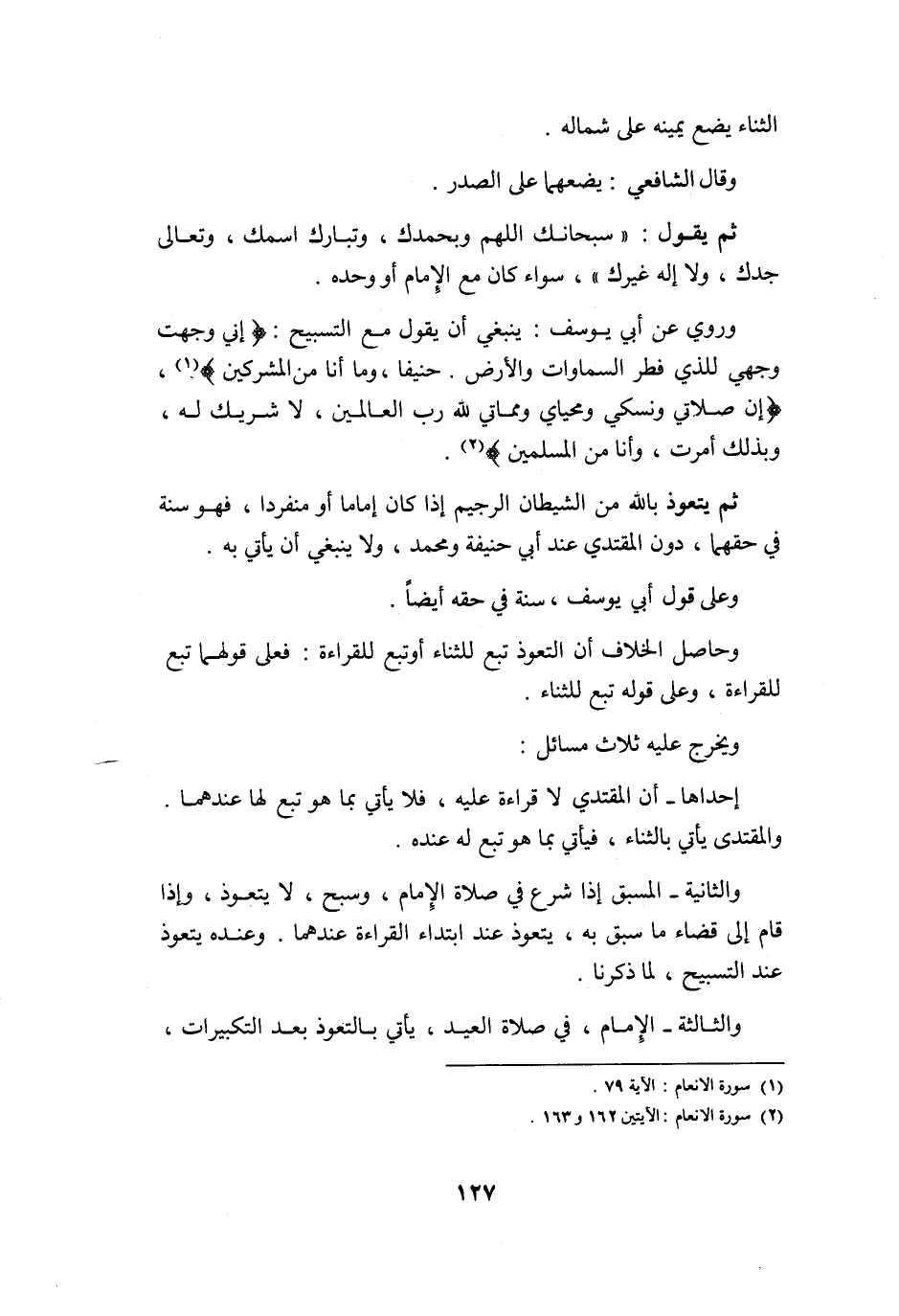 وَرُوِيَ عَن أبي يُوسُف يَنْبَغِي أَن يَقُول مَعَ التَّسْبِيح {إِنِّي وجهت وَجْهي للَّذي فطر السَّمَاوَات وَالْأَرْض حَنِيفا وَمَا أَنا من الْمُشْركين} {قل إِن صَلَاتي ونسكي ومحياي ومماتي لله رب الْعَالمين}