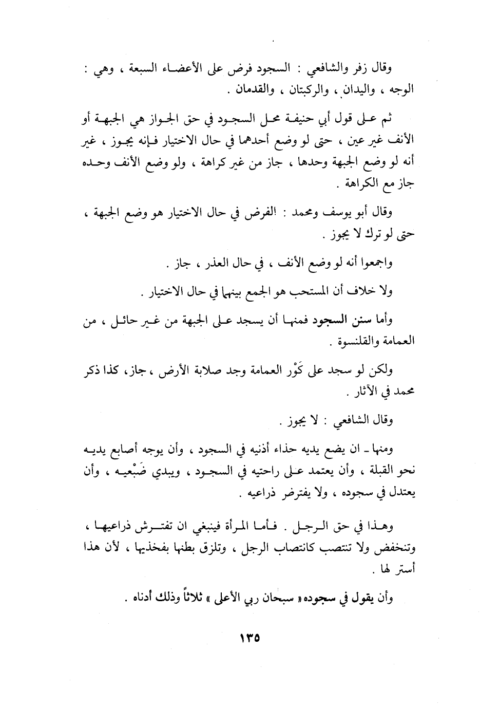 وقا لزفرالشافعي السُّجُود على الْأَعْضَاء السَّبْعَة وَهِي الْوَجْه وَالْيَدَانِ وَالرُّكْبَتَانِ وَالْقَدَمَانِ