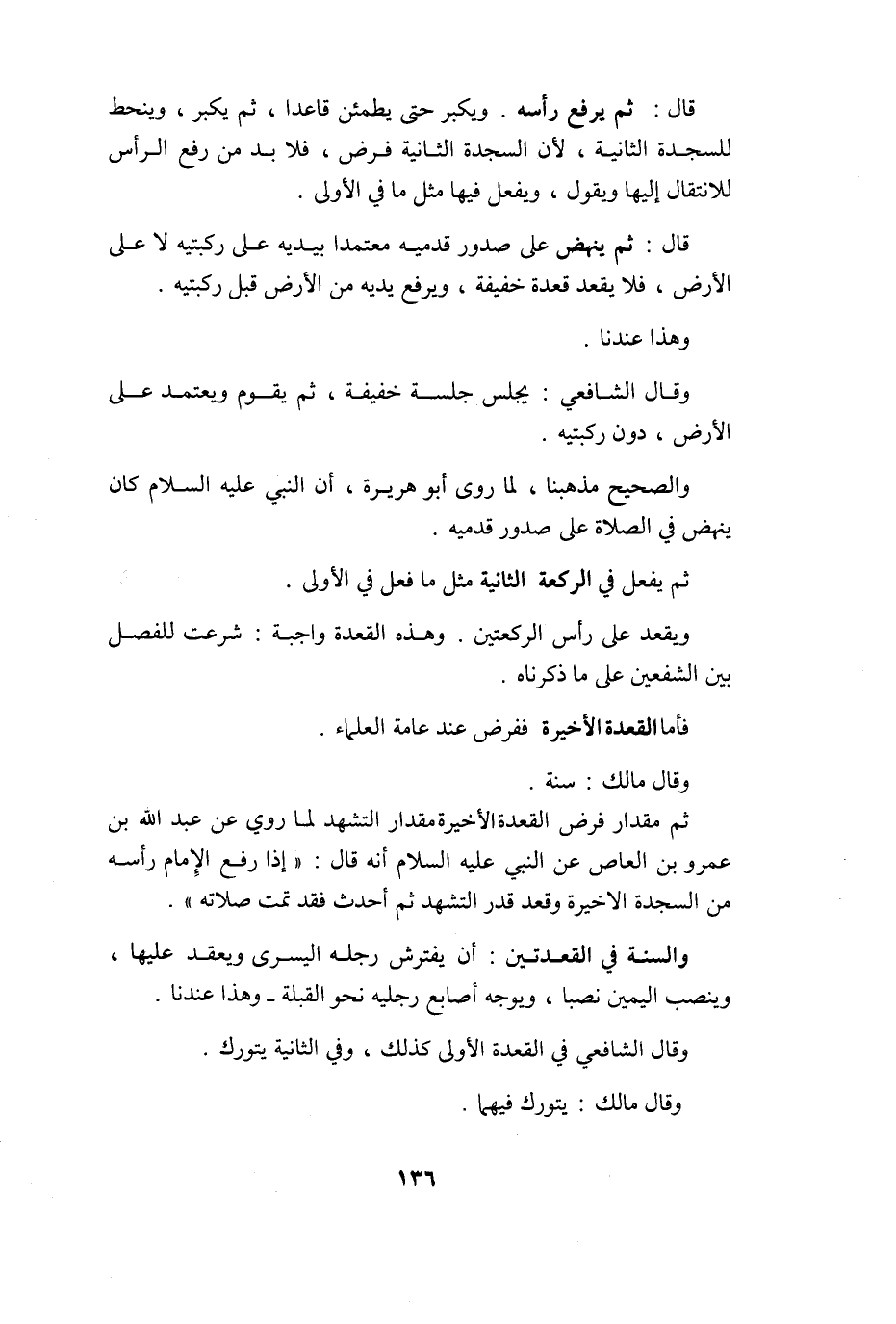 قَالَ ثمَّ ينْهض على صُدُور قَدَمَيْهِ مُعْتَمدًا بيدَيْهِ على رُكْبَتَيْهِ لَا على الأَرْض فَلَا يقْعد قعدة خَفِيفَة وَيرْفَع يَدَيْهِ من الأَرْض قبل رُكْبَتَيْهِ