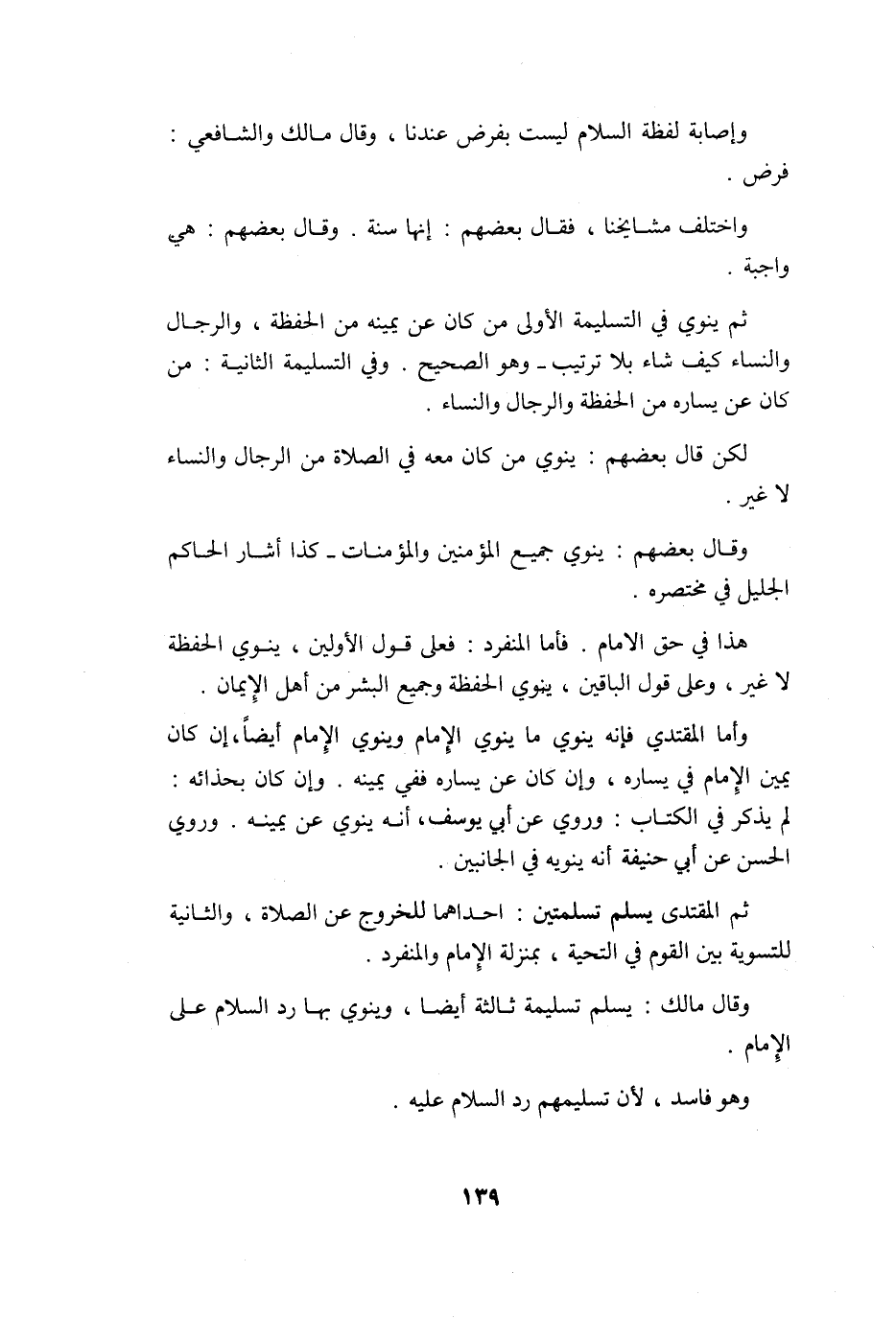 ثمَّ الْمُقْتَدِي يسلم تسليمتين إِحْدَاهمَا لِلْخُرُوجِ عَن الصَّلَاة وَالثَّانيَِة للتسوية بَين الْقَوْم فِي التَّحِيَّة بِمَنْزِلَة الإِمَام وَالْمُنْفَرد