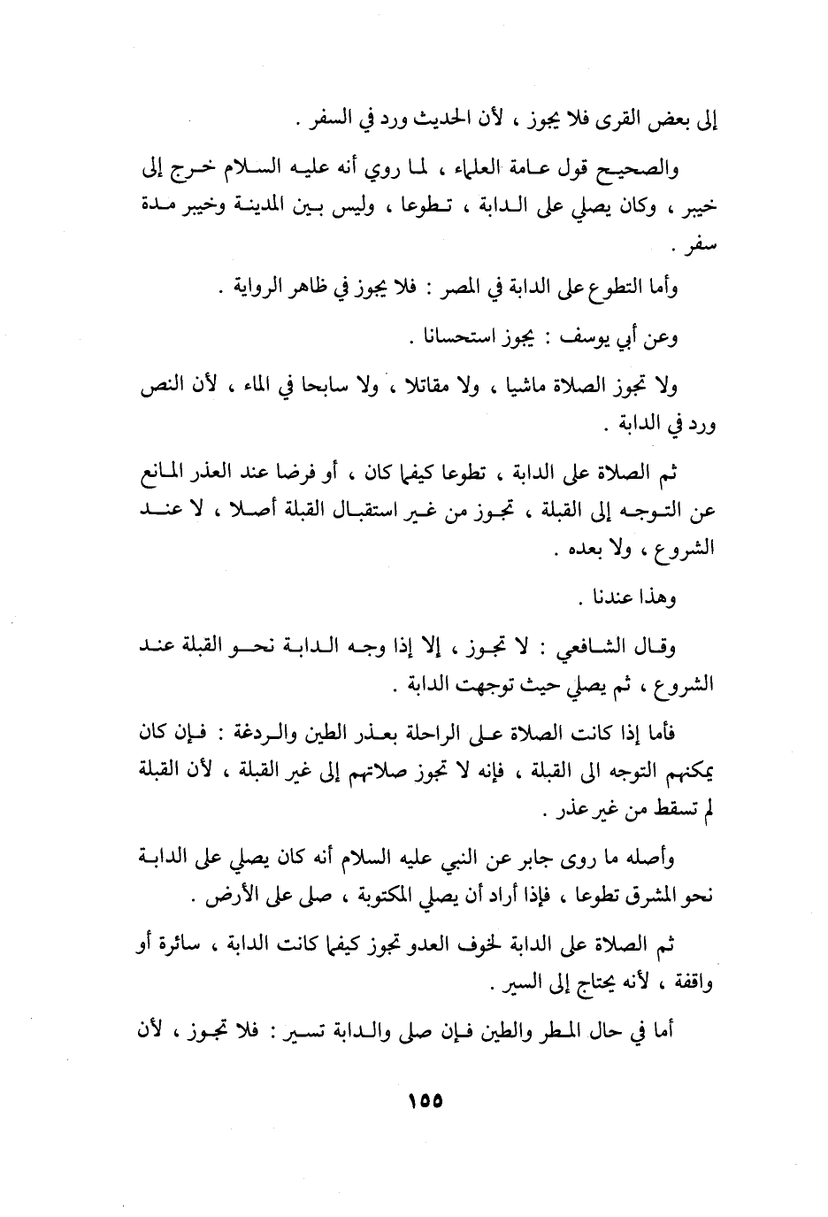 ثمَّ الصَّلَاة على الدَّابَّة تَطَوّعا كَيْفَمَا كَانَ أَو فرضا عِنْد الْعذر الْمَانِع عَن التَّوَجُّه إِلَى الْقبْلَة تجوز من غير اسْتِقْبَال الْقبْلَة أصلا لَا عِنْد الشُّرُوع وَلَا بعده
