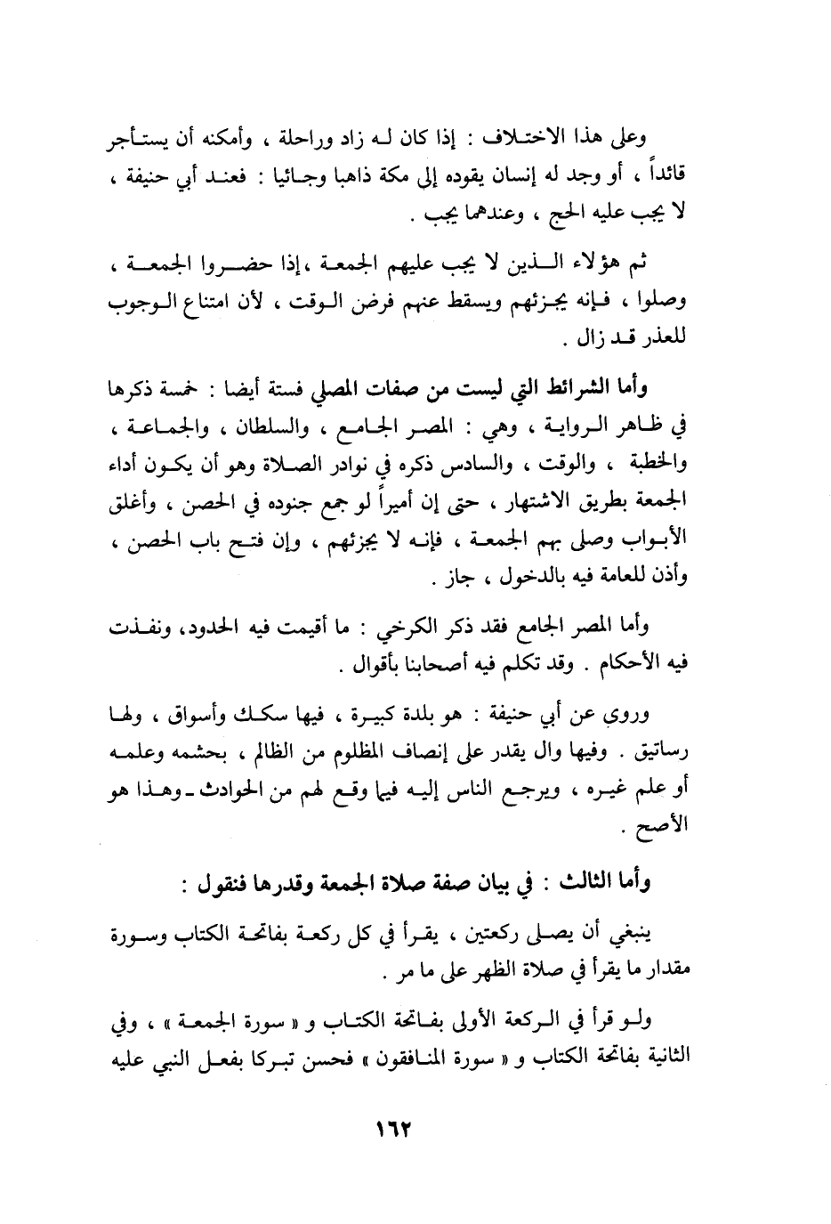 وَأما الثَّالِث فِي بَيَان صفة صَلَاة الْجُمُعَة وقدرها فَنَقُول يَنْبَغِي أَن يُصَلِّي رَكْعَتَيْنِ يقْرَأ فِي كل رَكْعَة بِفَاتِحَة الْكتاب وَسورَة مِقْدَار مَا يقْرَأ فِي صَلَاة الظّهْر على مَا مر