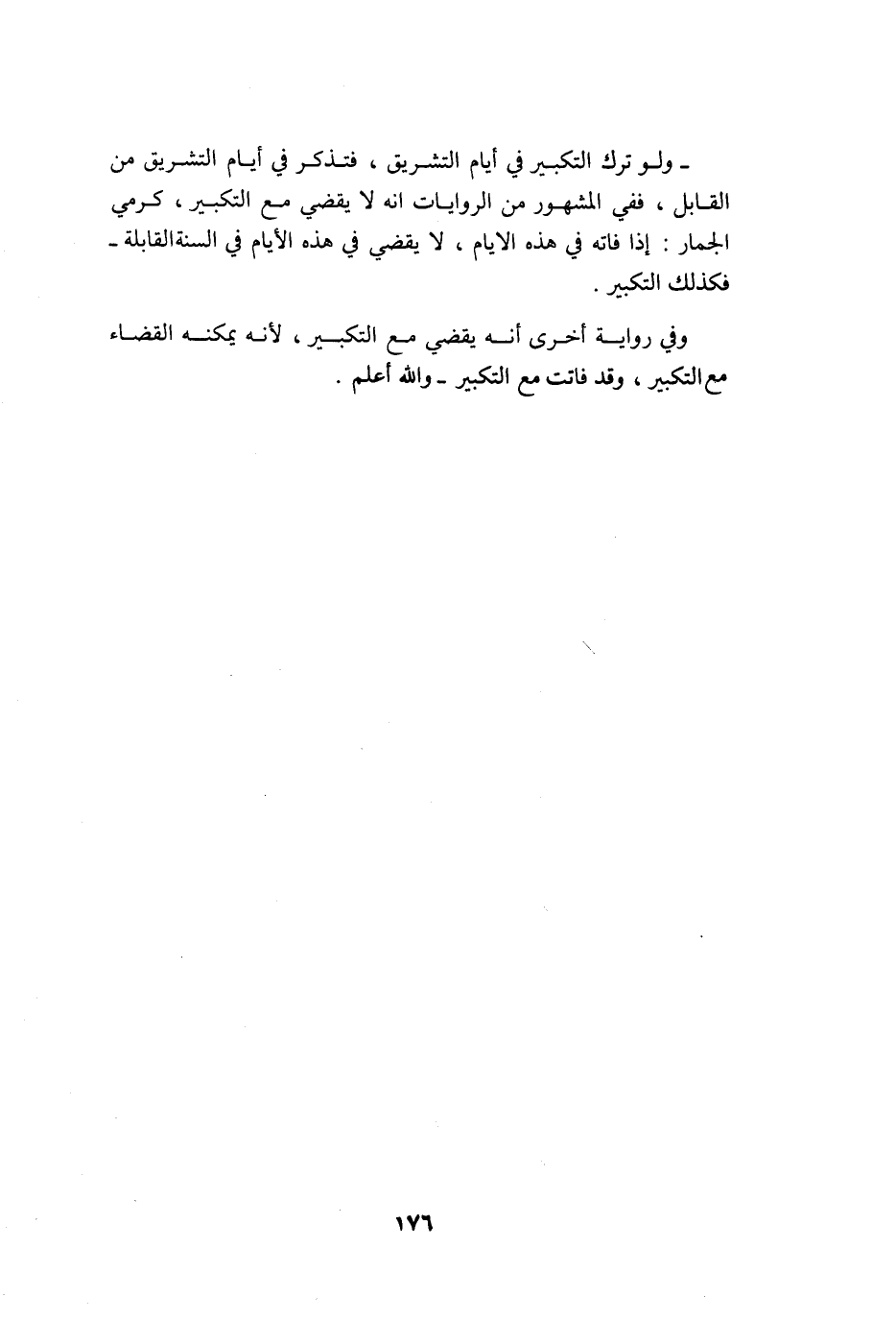 وَلَو ترك التَّكْبِير فِي أَيَّام التَّشْرِيق فَتذكر فِي أَيَّام التَّشْرِيق من الْقَابِل فَفِي الْمَشْهُور من الرِّوَايَات أَنه لَا يقْضِي مَعَ التَّكْبِير كرمي الْجمار إِذا فَاتَهُ فِي هَذِه الْأَيَّام لَا يقْضِي فِي هَذِه الْأَيَّام فِي السّنة الْقَابِلَة فَكَذَلِك التَّكْبِير
