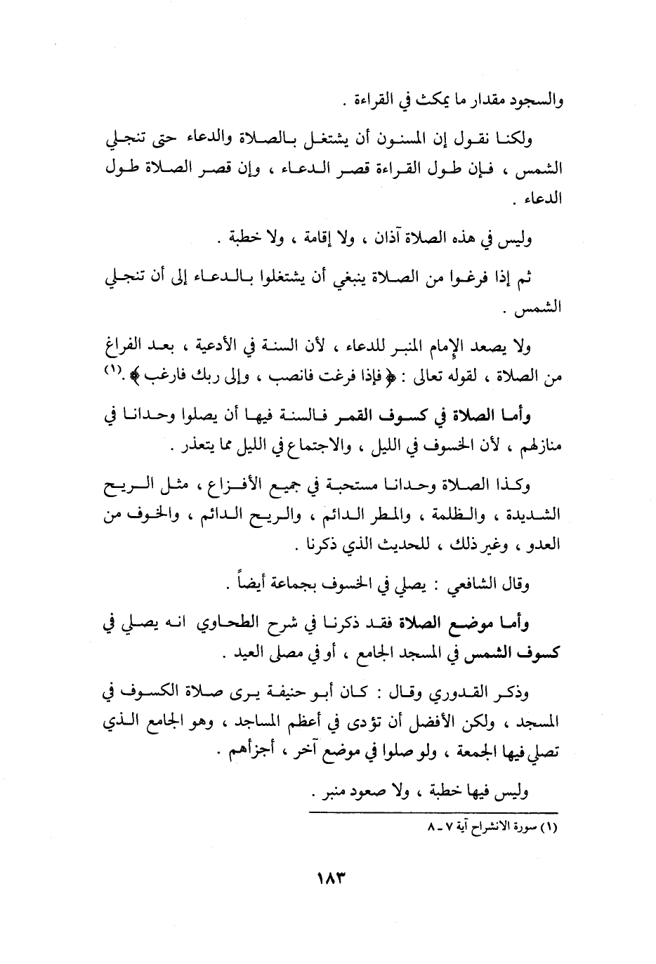 ولكننا نقُول إِن الْمسنون أَن يشْتَغل بِالصَّلَاةِ وَالدُّعَاء حَتَّى تنجلي الشَّمْس فَإِن طول الْقِرَاءَة قصر الدُّعَاء وَإِن قصر الصَّلَاة طول الدُّعَاء