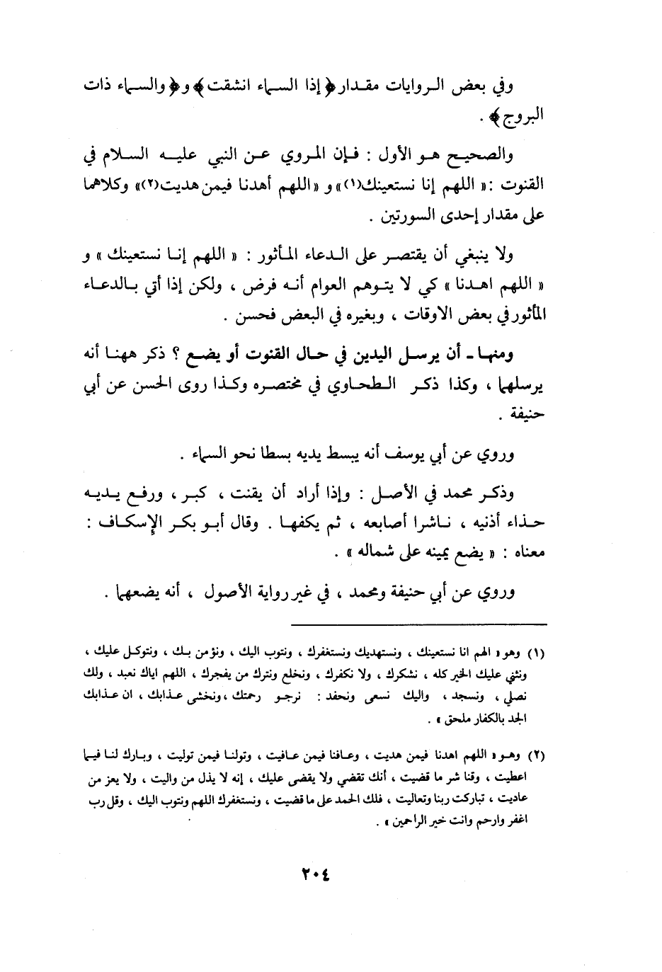 وَالصَّحِيح هُوَ الأول فَإِن الْمَرْوِيّ عَن النَّبِي عَلَيْهِ السَّلَام فِي الْقُنُوت اللَّهُمَّ إِنَّا نستعينك واللهم أهدنا فِيمَن هديت وَكِلَاهُمَا على مِقْدَار إِحْدَى السورتين