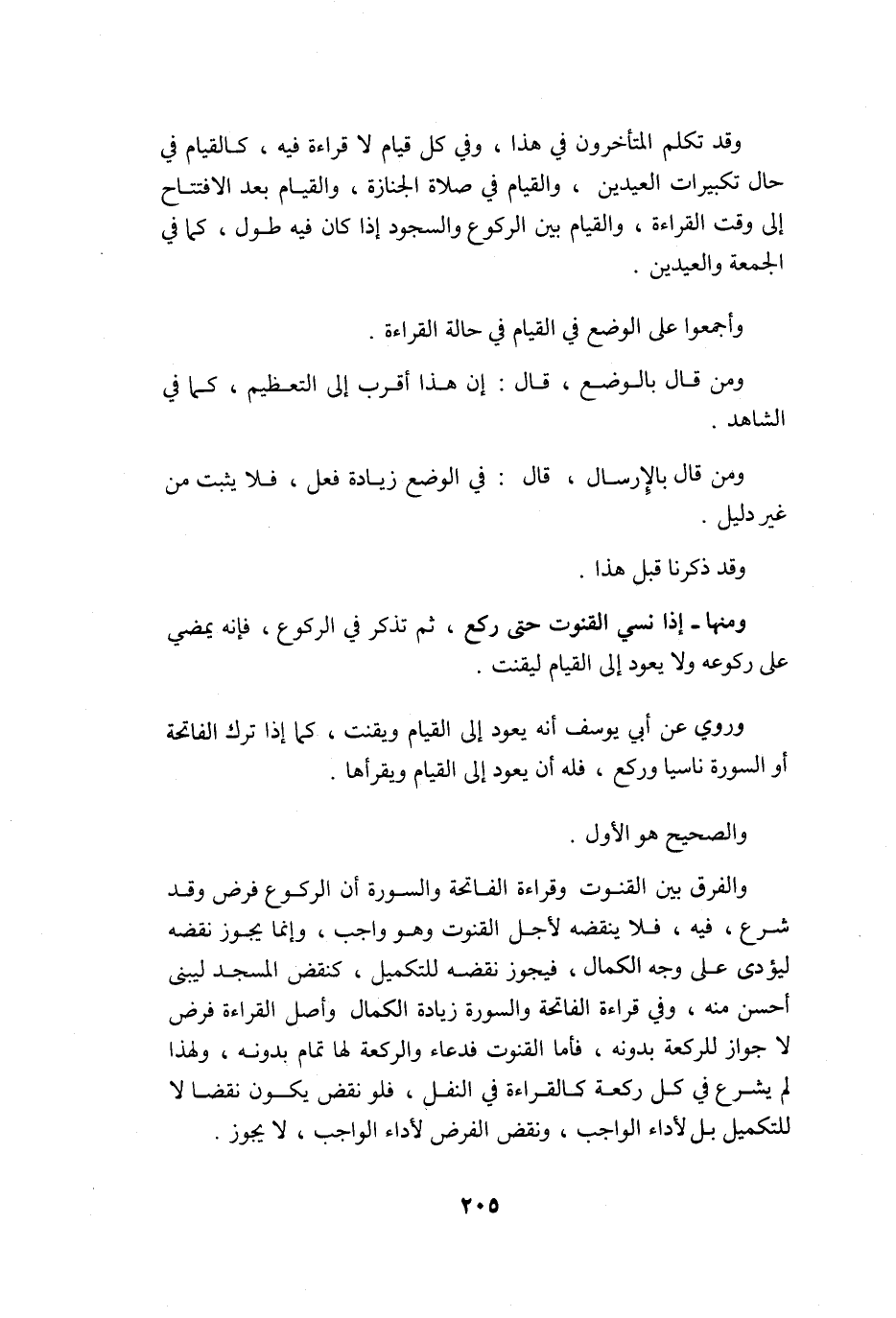 وَالْفرق بَين الْقُنُوت وَقِرَاءَة الْفَاتِحَة وَالسورَة أَن الرُّكُوع فرض وَقد شرع فِيهِ فَلَا ينْقضه لأجل الْقُنُوت وَهُوَ وَاجِب وَإِنَّمَا يجوز نقضه ليؤدى على وَجه الْكَمَال فَيجوز نقضه للتكميل كنقض الْمَسْجِد ليبنى أحسن مِنْهُ وَفِي قِرَاءَة الْفَاتِحَة وَالسورَة زِيَادَة الْكَمَال وأصل الْقِرَاءَة فرض لَا جَوَاز للركعة بِدُونِهِ فَأَما الْقُنُوت فدعاء والركعة لَهَا تَمام بِدُونِهِ وَلِهَذَا لم يشرع فِي كل رَكْعَة كالقراءة فِي النَّفْل فَلَو نقض يكون نقضا لَا للتكميل بل لأَدَاء الْوَاجِب وَنقض الْفَرْض لأَدَاء الْوَاجِب لَا يجوز