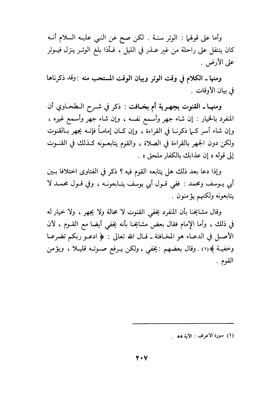 وَمِنْهَا الْقُنُوت بجهرية أم بخافت ذكر فِي شرح الطَّحَاوِيّ أَن الْمُنْفَرد بِالْخِيَارِ إِن شَاءَ جهر وأسمع نَفسه وَإِن شَاءَ جهر وأسمع غَيره وَإِن شَاءَ أسر كَمَا ذكرنَا فِي الْقِرَاءَة وَإِن كَانَ إِمَامًا فَإِنَّهُ يجْهر بِالْقُنُوتِ وَلَكِن دون الْجَهْر بِالْقِرَاءَةِ فِي الصَّلَاة وَالْقَوْم يتابعونه كَذَلِك فِي الْقُنُوت إِلَى قَوْله إِن عذابك بالكفار مُلْحق