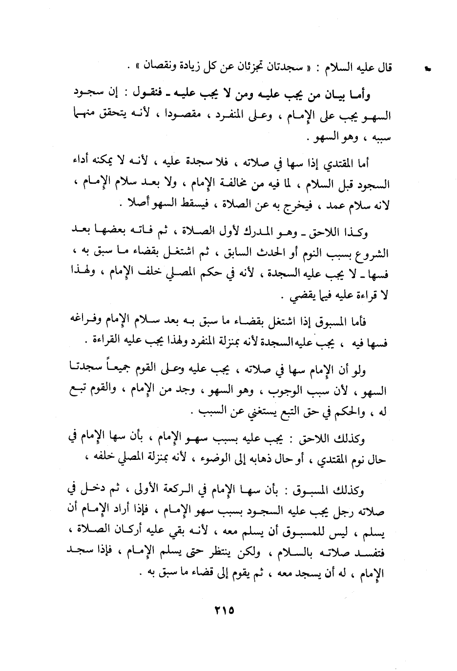 وَكَذَلِكَ الْمَسْبُوق بِأَن سَهَا الإِمَام فِي الرَّكْعَة الأولى ثمَّ دخل فِي صلَاته رجل يجب عَلَيْهِ السُّجُود بِسَبَب سَهْو الإِمَام فَإِذا أَرَادَ الإِمَام أَن يسلم لَيْسَ للمسبوق أَن يسلم مَعَه لِأَنَّهُ بَقِي عَلَيْهِ أَرْكَان الصَّلَاة فتفسد صلَاته بِالسَّلَامِ وَلَكِن ينْتَظر حَتَّى يسلم الإِمَام فَإِذا سجد الإِمَام لَهُ أَن يسْجد مَعَه ثمَّ يقوم إِلَى قَضَاء مَا سبق بِهِ