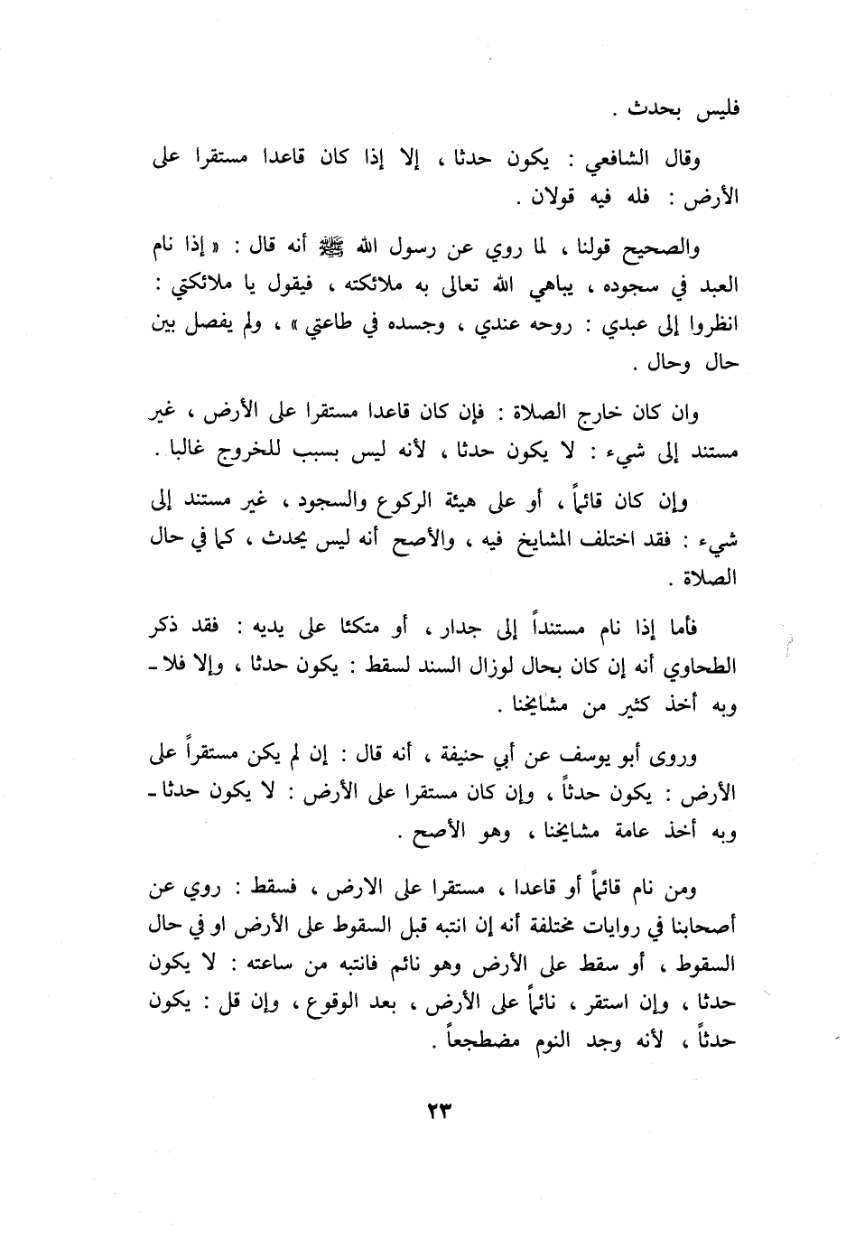 وَمن نَام قَائِما أَو قَاعِدا مُسْتَقرًّا على الأَرْض فَسقط رُوِيَ عَن أَصْحَابنَا فِي رِوَايَات مُخْتَلفَة أَنه إِن انتبه قبل السُّقُوط على الأَرْض أَو فِي حَال السُّقُوط أَو سقط على الأَرْض وَهُوَ نَائِم فانتبه من سَاعَته لَا يكون حَدثا وَإِن اسْتَقر نَائِما على الأَرْض بعد الْوُقُوع وَإِن قل يكون حَدثا لِأَنَّهُ وجد النّوم مُضْطَجعا