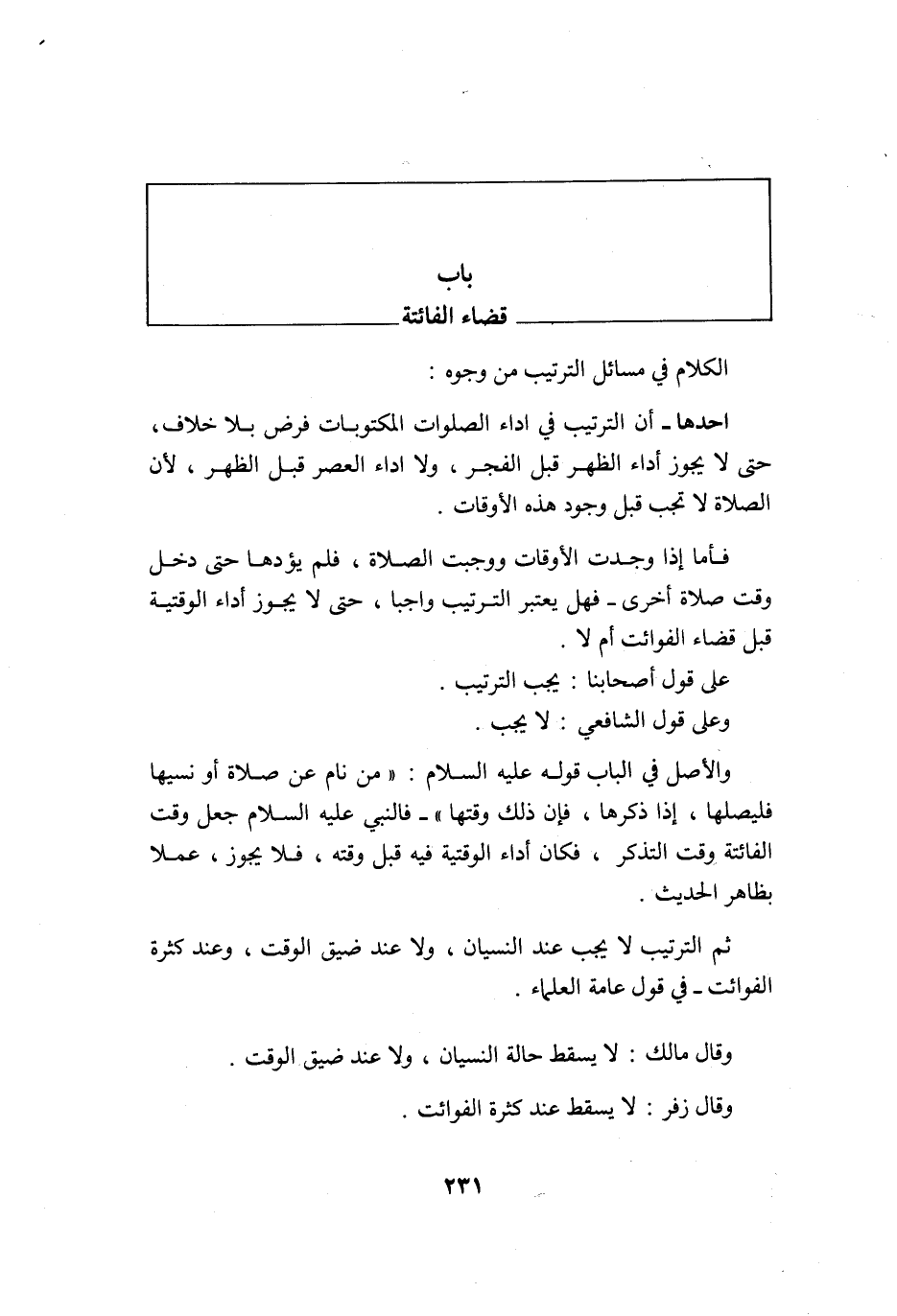 ثمَّ التَّرْتِيب لَا يجب عِنْد النسْيَان وَلَا عِنْد ضيق الْوَقْت وَعند كَثْرَة الْفَوَائِت فِي قَول عَامَّة الْعلمَاء