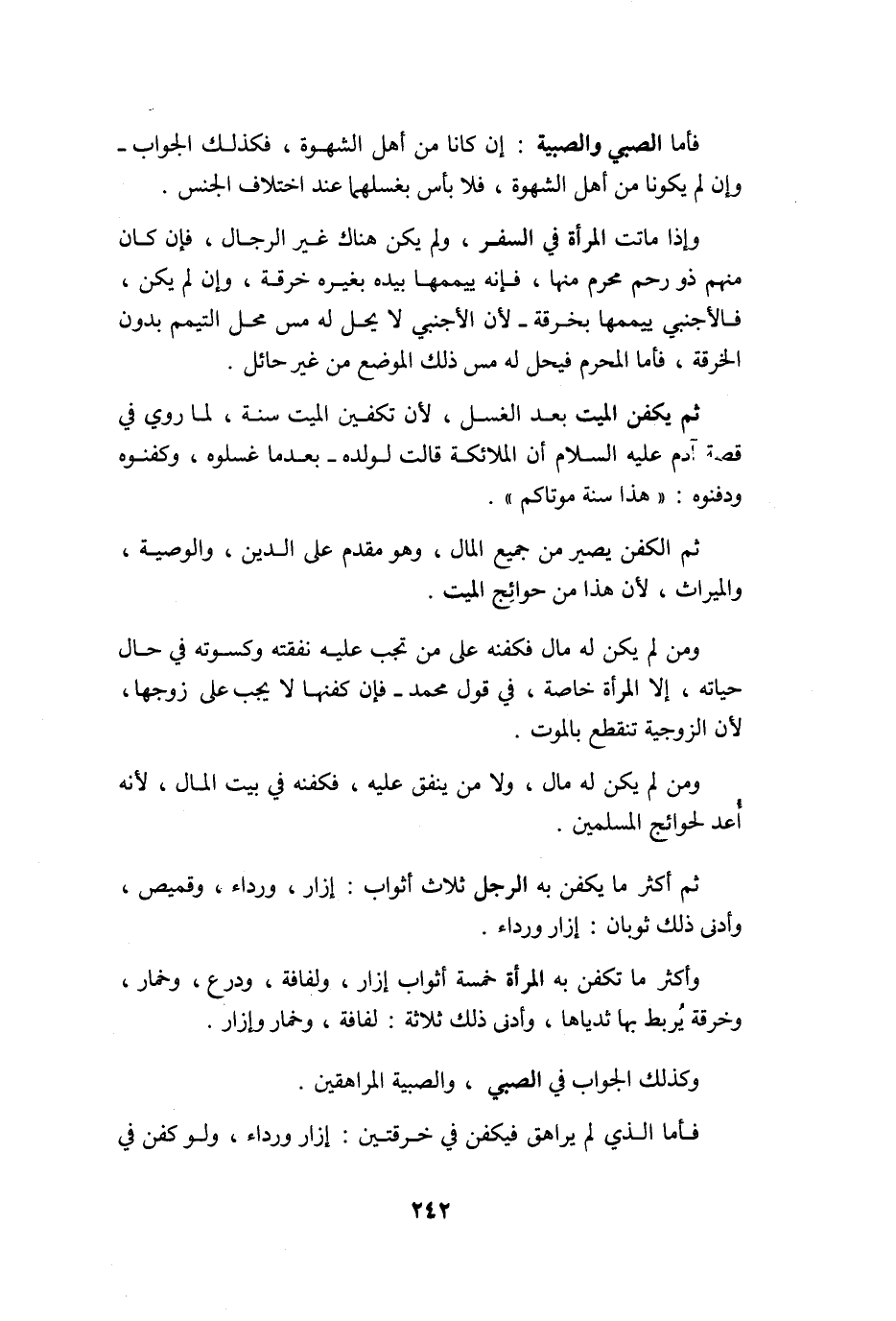 ثمَّ أَكثر مَا يُكفن بِهِ الرجل ثَلَاث أَثوَاب إِزَار ورداء وقميص وَأدنى ذَلِك ثَوْبَان إِزَار ورداء