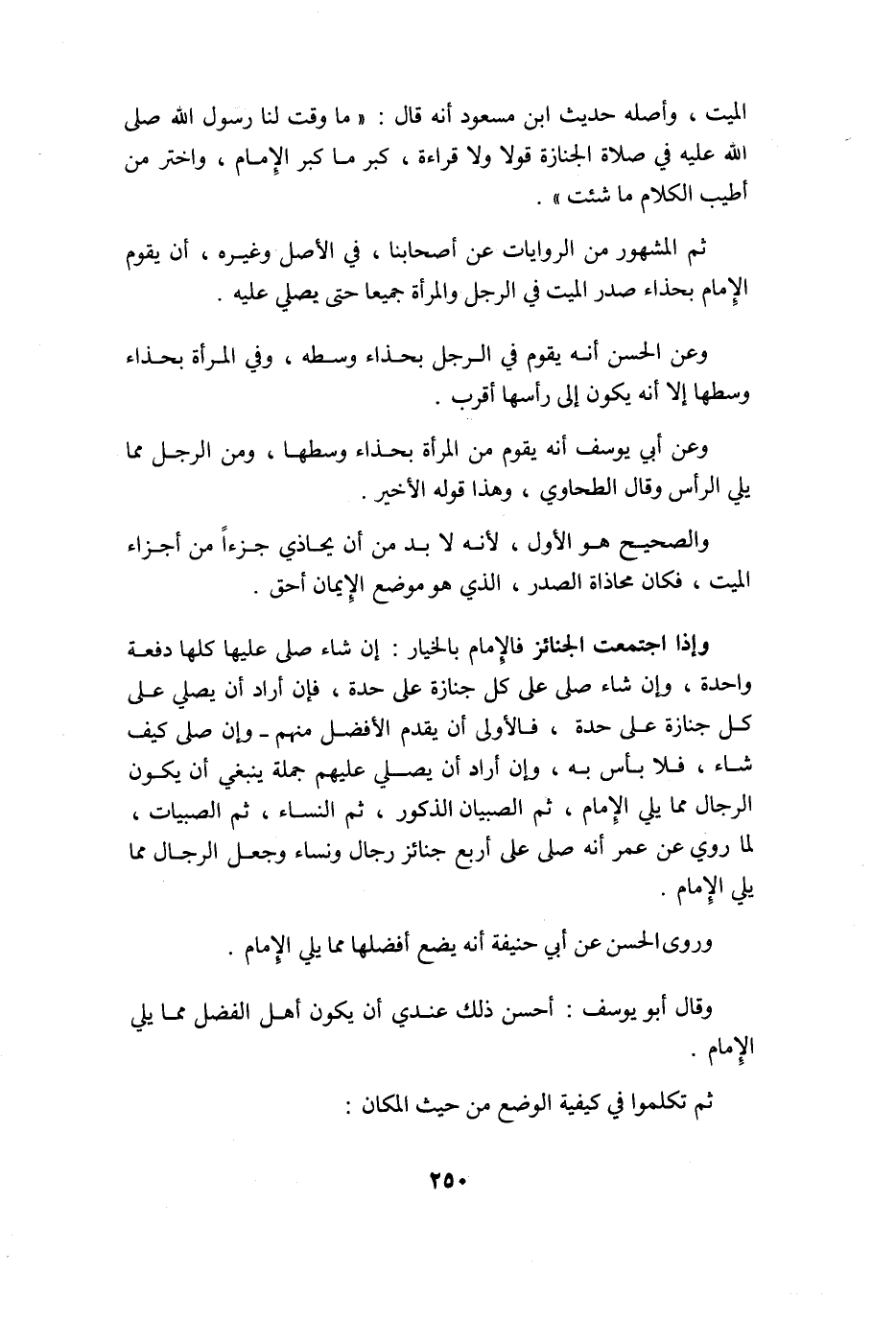 ثمَّ الْمَشْهُور من الرِّوَايَات عَن أَصْحَابنَا فِي الأَصْل وَغَيره أَن يقوم الإِمَام بحذاء صدر الْمَيِّت فِي الرجل وَالْمَرْأَة جَمِيعًا حَتَّى يُصَلِّي عَلَيْهِ