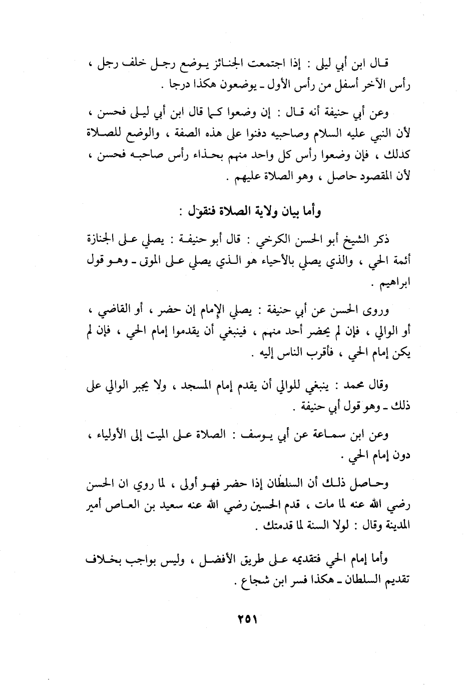 وَأما بَيَان ولَايَة الصَّلَاة فَنَقُول ذكر الشيخأبو الْحسن الْكَرْخِي قَالَ أَبُو حنيفَة يُصَلِّي على الْجِنَازَة أَئِمَّة الْحَيّ وَالَّذِي يُصَلِّي بالأحياء هُوَ الَّذِي يُصَلِّي على الْمَوْتَى وَهُوَ قَول إِبْرَاهِيم