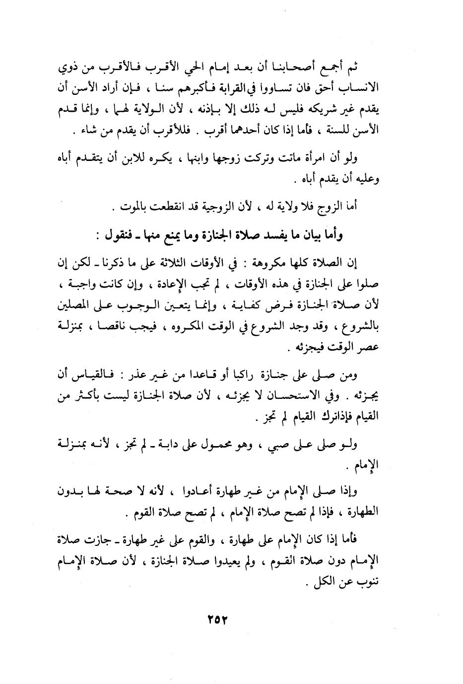 ثمَّ أجمع أَصْحَابنَا أَن بعد إِمَام الْحَيّ الْأَقْرَب فَالْأَقْرَب من ذَوي الْأَنْسَاب أَحَق فَإِن تساووا فِي الْقَرَابَة فأكبرهم سنا فَإِن أَرَادَ الأسن أَن يقدم غير شَرِيكه فَلَيْسَ لَهُ ذَلِك إِلَّا بِإِذْنِهِ لِأَن الْولَايَة لَهما وَإِنَّمَا قدم الأسن للسّنة فَأَما إِذا كَانَ أَحدهمَا أقرب