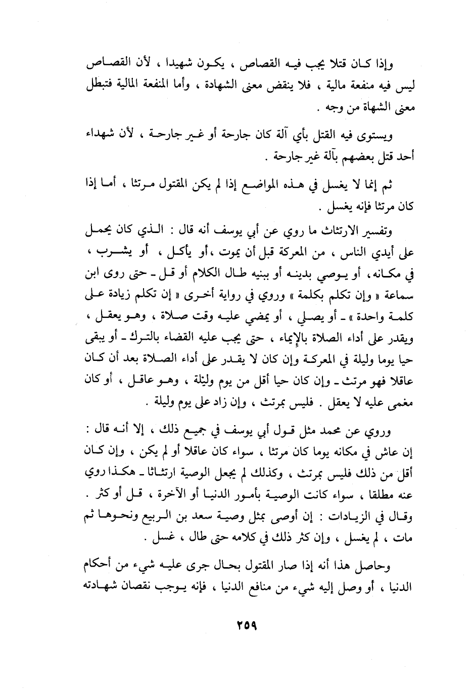 وَتَفْسِير الارتثاث مَا رُوِيَ عَن أبي يُوسُف أَنه قَالَ الَّذِي كَانَ يحمل على أَيدي النَّاس من المعركة قبل أَن يَمُوت أَو يَأْكُل أَو يشرب فِي مَكَانَهُ أَو يُوصي بِدِينِهِ أَو ببنيه طَال الْكَلَام أَو قل حَتَّى روى ابْن سَمَّاعَة وَإِن تكلم بِكَلِمَة وَرُوِيَ فِي رِوَايَة أُخْرَى إِن تكلم زِيَادَة على كلمة وَاحِدَة أَو يُصَلِّي أَو يمْضِي عَلَيْهِ وَقت صَلَاة وَهُوَ يعقل وَيقدر على أَدَاء الصَّلَاة بِالْإِيمَاءِ حَتَّى يجب عَلَيْهِ الْقَضَاء بِالتّرْكِ أَو يبْقى حَيا يَوْمًا وَلَيْلَة فِي المعركة وَإِن كَانَ لَا يقدر على أَدَاء الصَّلَاة بعد أَن كَانَ عَاقِلا فَهُوَ مرتث وَإِن كَانَ حَيا أقل من يَوْم وَلَيْلَة وَهُوَ عَاقل أَو كَانَ مغمى عَلَيْهِ لَا يعقل فَلَيْسَ بمرتث وَإِن زَاد على يَوْم وَلَيْلَة