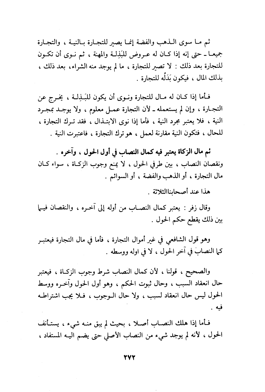 ثمَّ مَال الزَّكَاة يعْتَبر فِيهِ كَمَال النّصاب فِي أول الْحول وَآخره