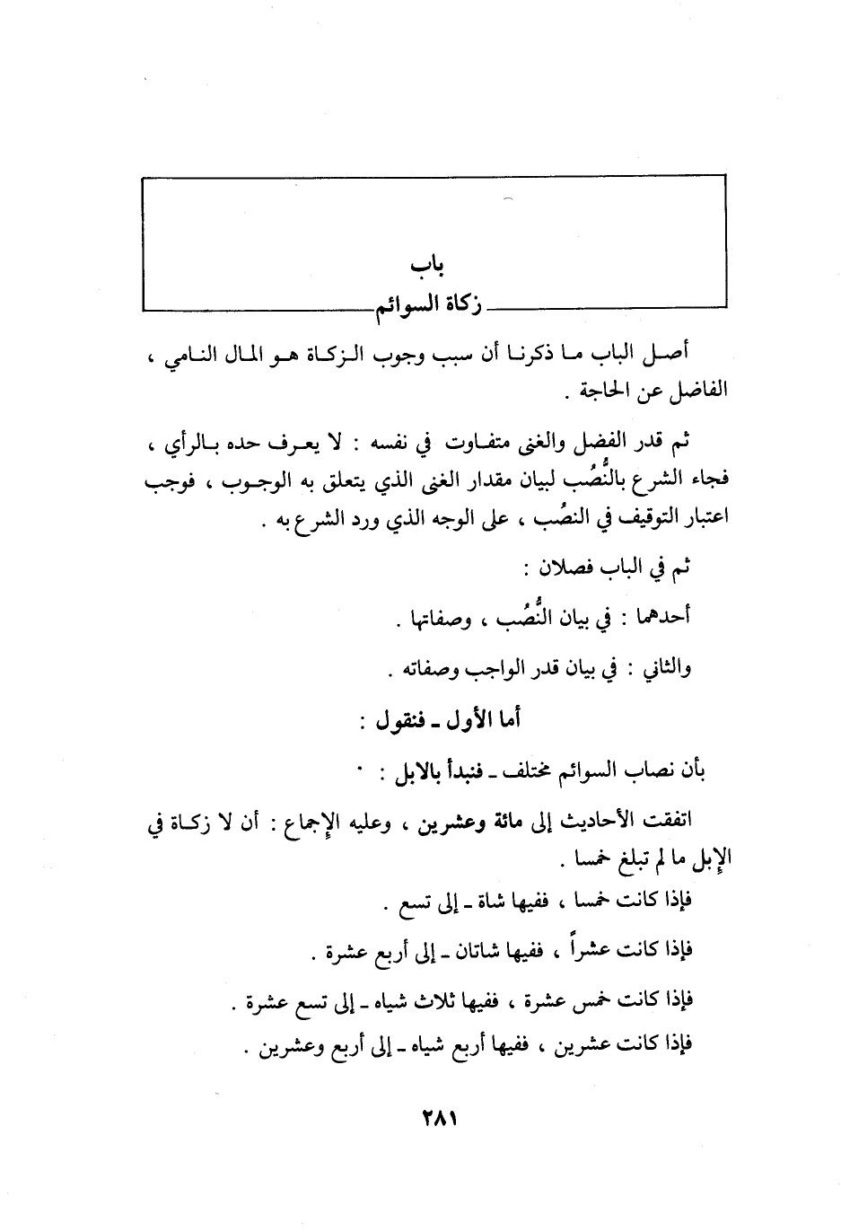 أما الأول فَنَقُول بِأَن نِصَاب السوائم مُخْتَلف فنبدأ بِالْإِبِلِ