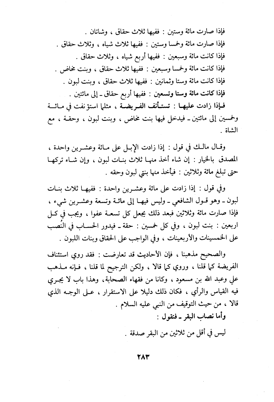 فَإِذا زَادَت عَلَيْهَا تسْتَأْنف الْفَرِيضَة مِثْلَمَا استؤنفت فِي مائَة وَخمسين إِلَى مِائَتَيْنِ فَيدْخل فِيهَا بنت مَخَاض وَبنت لبون وحقة مَعَ الشَّاة