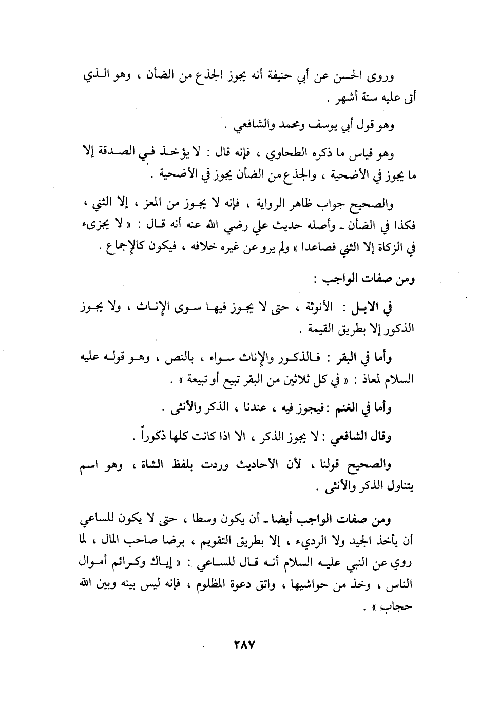 وَمن صِفَات الْوَاجِب أَيْضا أَن يكون وسطا حَتَّى لَا يكون للساعي أَن يَأْخُذ الْجيد وَلَا الرَّدِيء إِلَّا بطرِيق التَّقْوِيم بِرِضا صَاحب المَال لما رُوِيَ عَن النَّبِي عَلَيْهِ السَّلَام أَنه قَالَ للساعي إياك وكرائم أَمْوَال النَّاس وَخذ من حواشيها وَاتَّقِ دَعْوَة الْمَظْلُوم فَإِنَّهُ لَيْسَ بَينه وَبَين الله حجاب