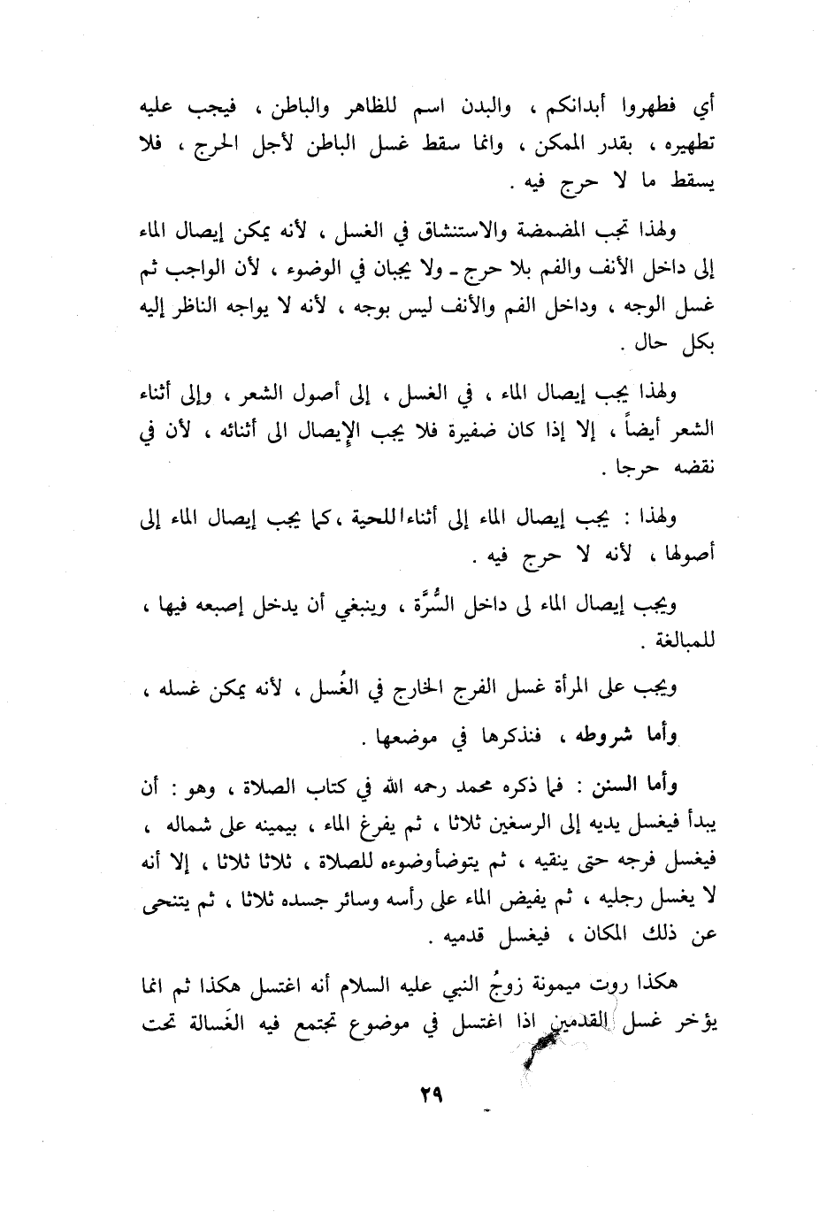 وَأما السّنَن فَمَا ذكره محمدرحمه الله فِي كتاب الصَّلَاة وَهُوَ أَن يبْدَأ فَيغسل يَدَيْهِ إِلَى الرسغين ثَلَاثًا ثمَّ يفرغ المَاء بِيَمِينِهِ على شِمَاله فَيغسل فرجه حَتَّى ينقيه ثمَّ يتَوَضَّأ وضوءه للصَّلَاة ثَلَاثًا ثَلَاثًا إِلَّا أَنه لَا يغسل رجلَيْهِ ثمَّ يفِيض المَاء على رَأسه وَسَائِر جسده ثَلَاثًا ثمَّ يتَنَحَّى عَن ذَلِك الْمَكَان فَيغسل قَدَمَيْهِ