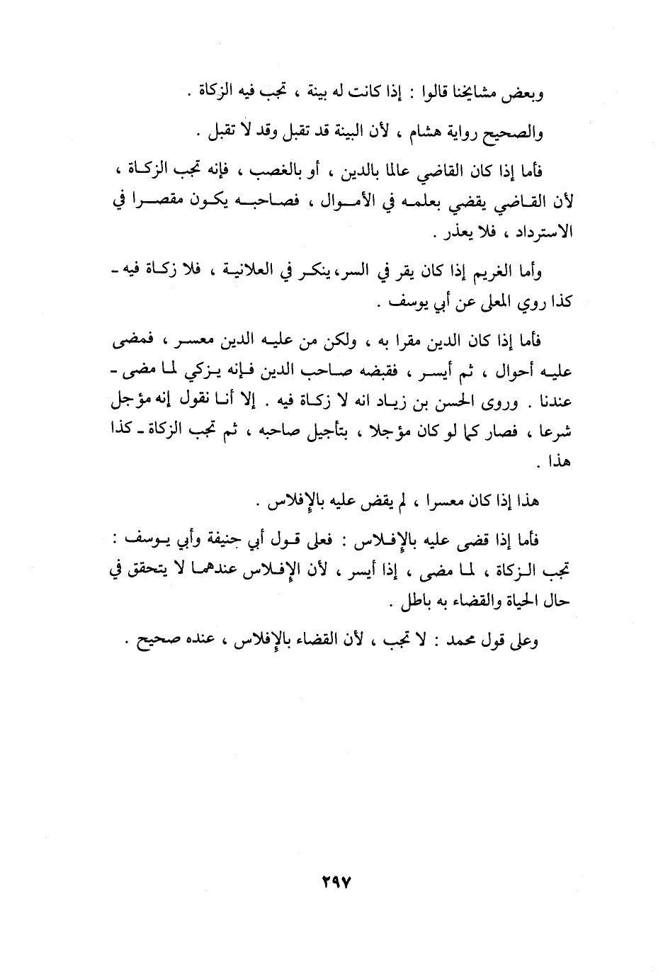 فَأَما إِذا قضى عَلَيْهِ بالإفلاس فعلى قَول أبي حنيفَة وَأبي يُوسُف تجب الزَّكَاة لما مضى إِذا أيسر لِأَن الإفلاس عِنْدهمَا لَا يتَحَقَّق فِي حَال الْحَيَاة وَالْقَضَاء بِهِ بَاطِل