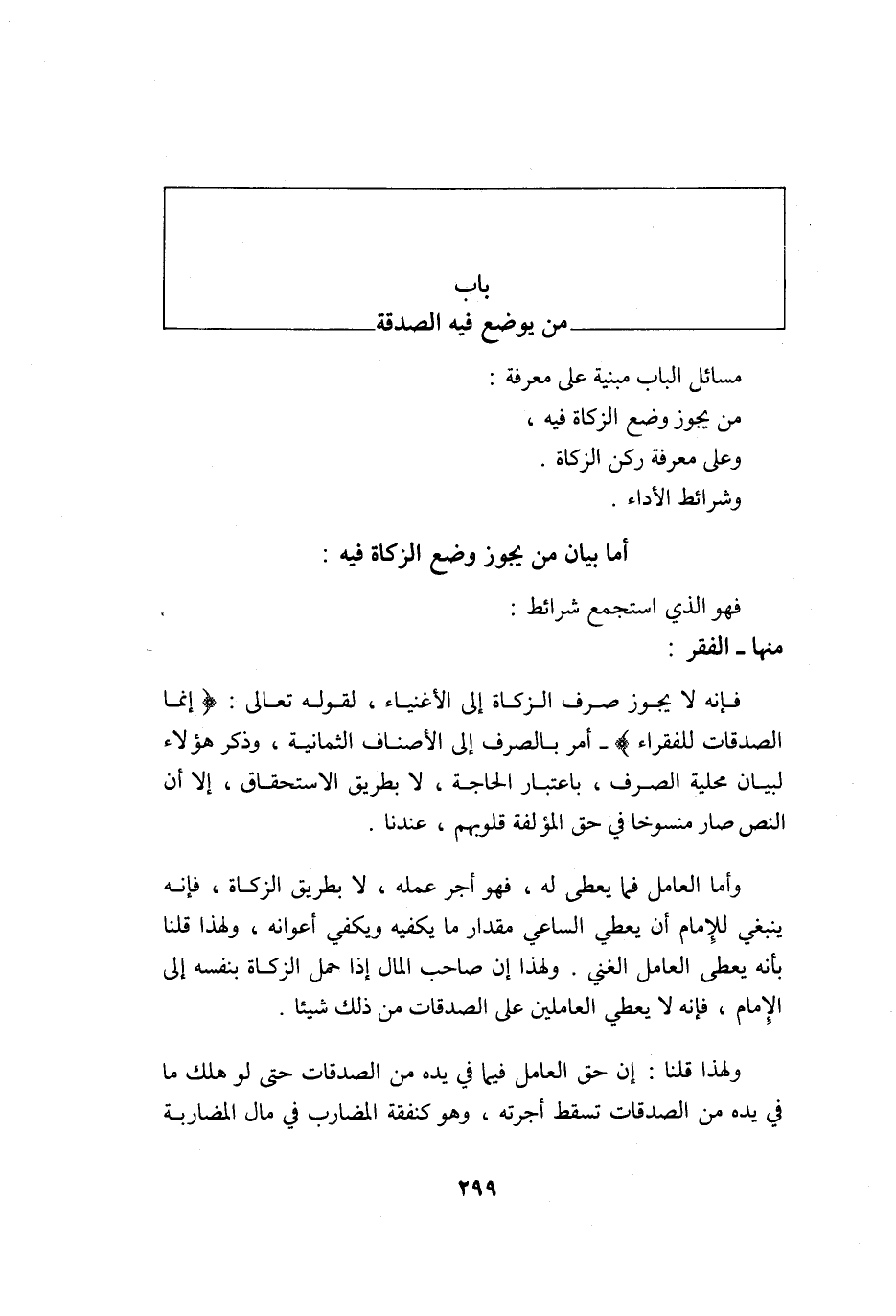 مسَائِل الْبَاب مَبْنِيَّة على معرفَة من يجوز وضع الزَّكَاة فِيهِ وعَلى معرفَة ركن الزَّكَاة وشرائط الْأَدَاء