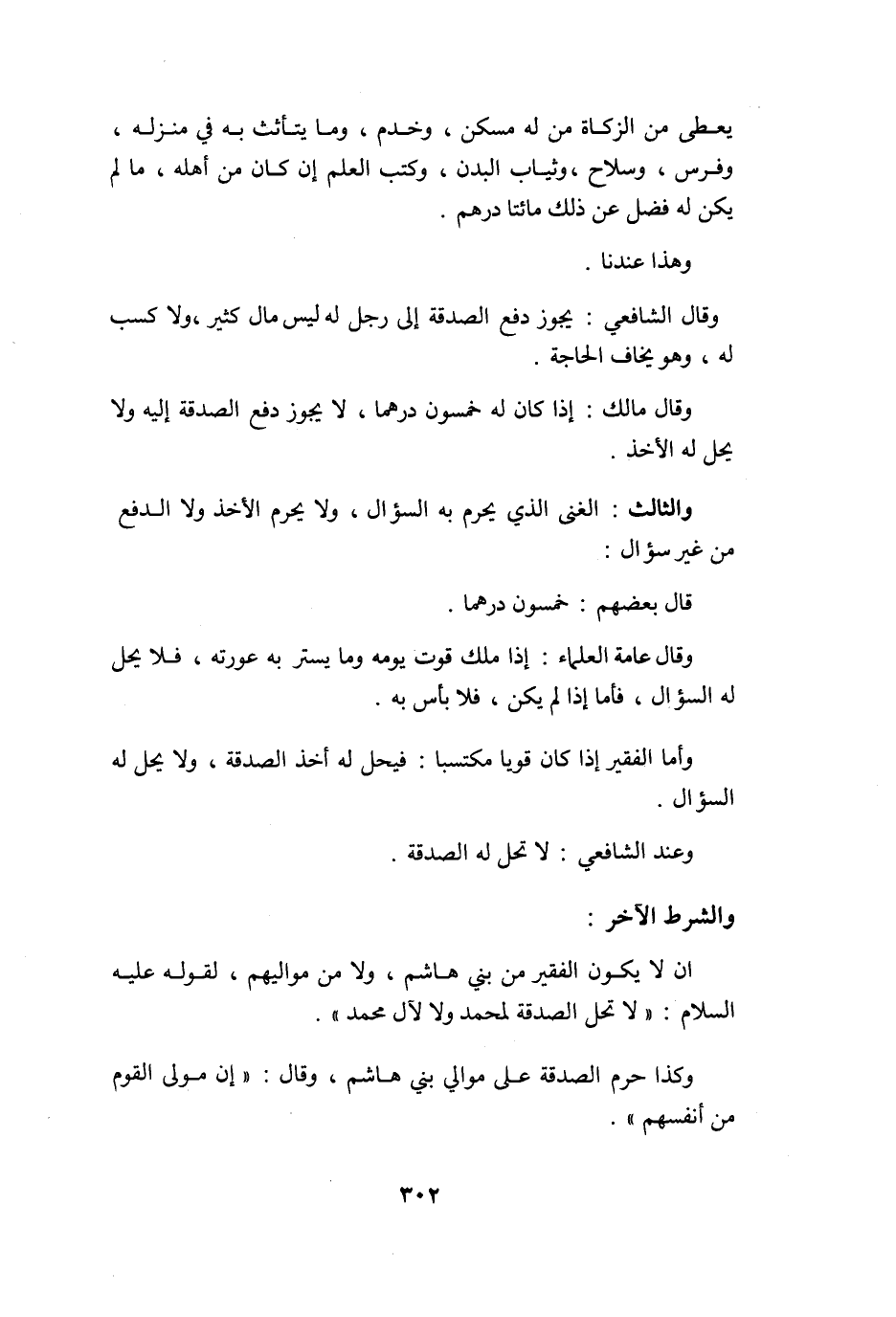 يُعْطي من الزَّكَاة من لَهُ مسكن وخدم وَمَا يتأثث بِهِ فِي منزله وَفرس وَسلَاح وَثيَاب الْبدن وَكتب الْعلم إِن كَانَ من أَهله مَا لم يكن لَهُ فضل عَن ذَلِك مِائَتَا دِرْهَم
