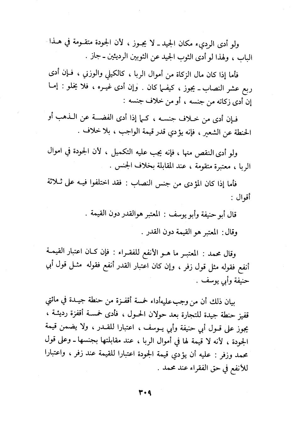 بَيَان ذَلِك أَن من وَجب عَلَيْهِ أَدَاء خَمْسَة أَقْفِزَة من حِنْطَة جَيِّدَة فِي مِائَتي قفيز حِنْطَة جَيِّدَة للتِّجَارَة بعد حولان الْحول فَأدى خَمْسَة أَقْفِزَة رَدِيئَة يجوز على قَول أبي حنيفَة وَأبي يُوسُف اعْتِبَارا للقدر وَلَا يضمن قيمَة الْجَوْدَة لِأَنَّهُ لَا قيمَة لَهَا فِي أَمْوَال الرِّبَا عِنْد مقابلتها بجنسها وعَلى قَول مُحَمَّد وَزفر عَلَيْهِ أَن يُؤَدِّي قيمَة الْجَوْدَة اعْتِبَارا للقيمة عِنْد زفر واعتبارا للأنفع فِي حق الْفُقَرَاء عِنْد مُحَمَّد
