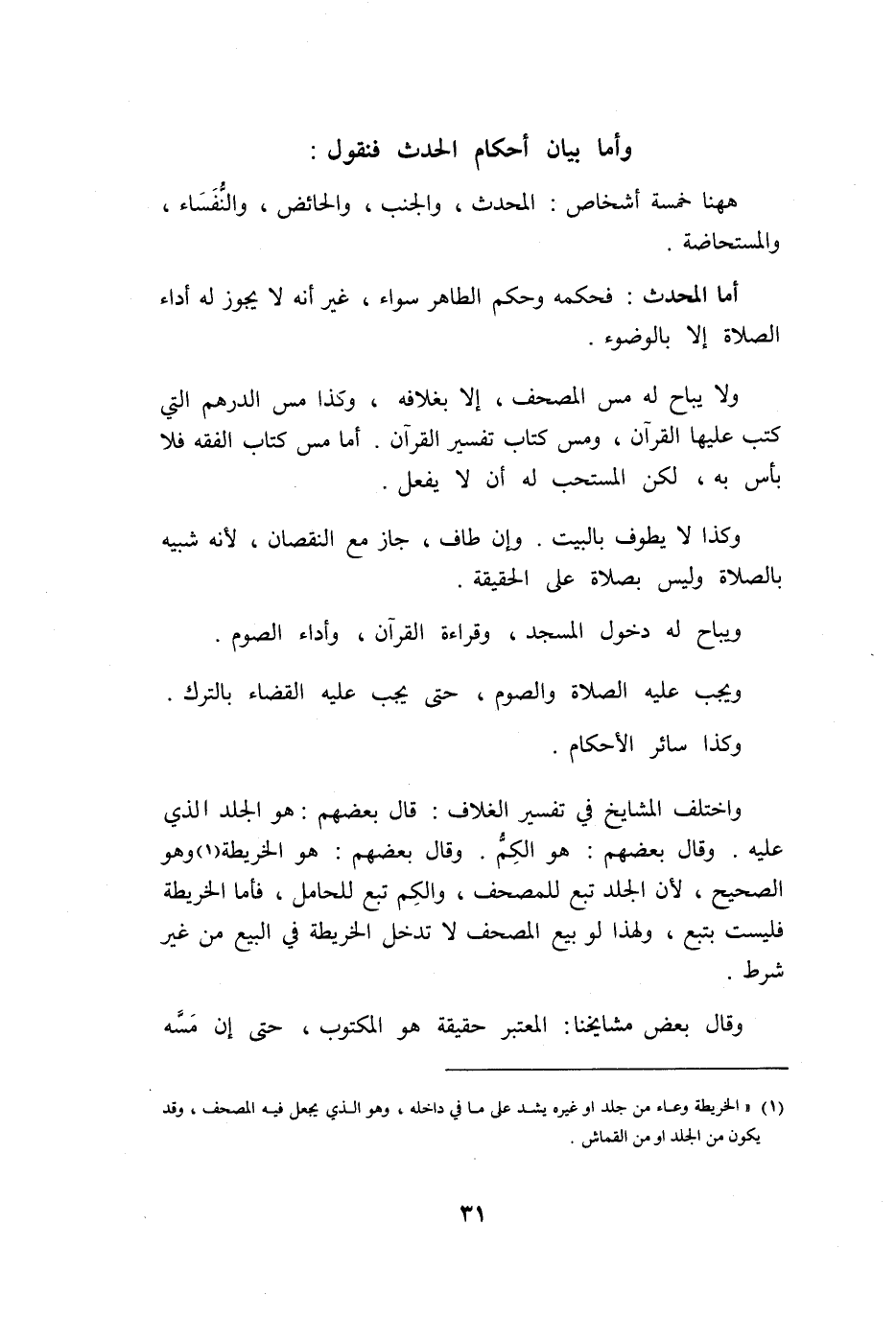 وَأما بَيَان أَحْكَام الْحَدث فَنَقُول هَهُنَا خَمْسَة أشخاص الْمُحدث وَالْجنب وَالْحَائِض وَالنُّفَسَاء والمستحاضة