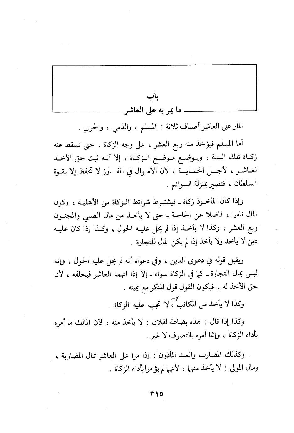 الْمَار على الْعَاشِر أَصْنَاف ثَلَاثَة الْمُسلم وَالذِّمِّيّ وَالْحَرْبِيّ