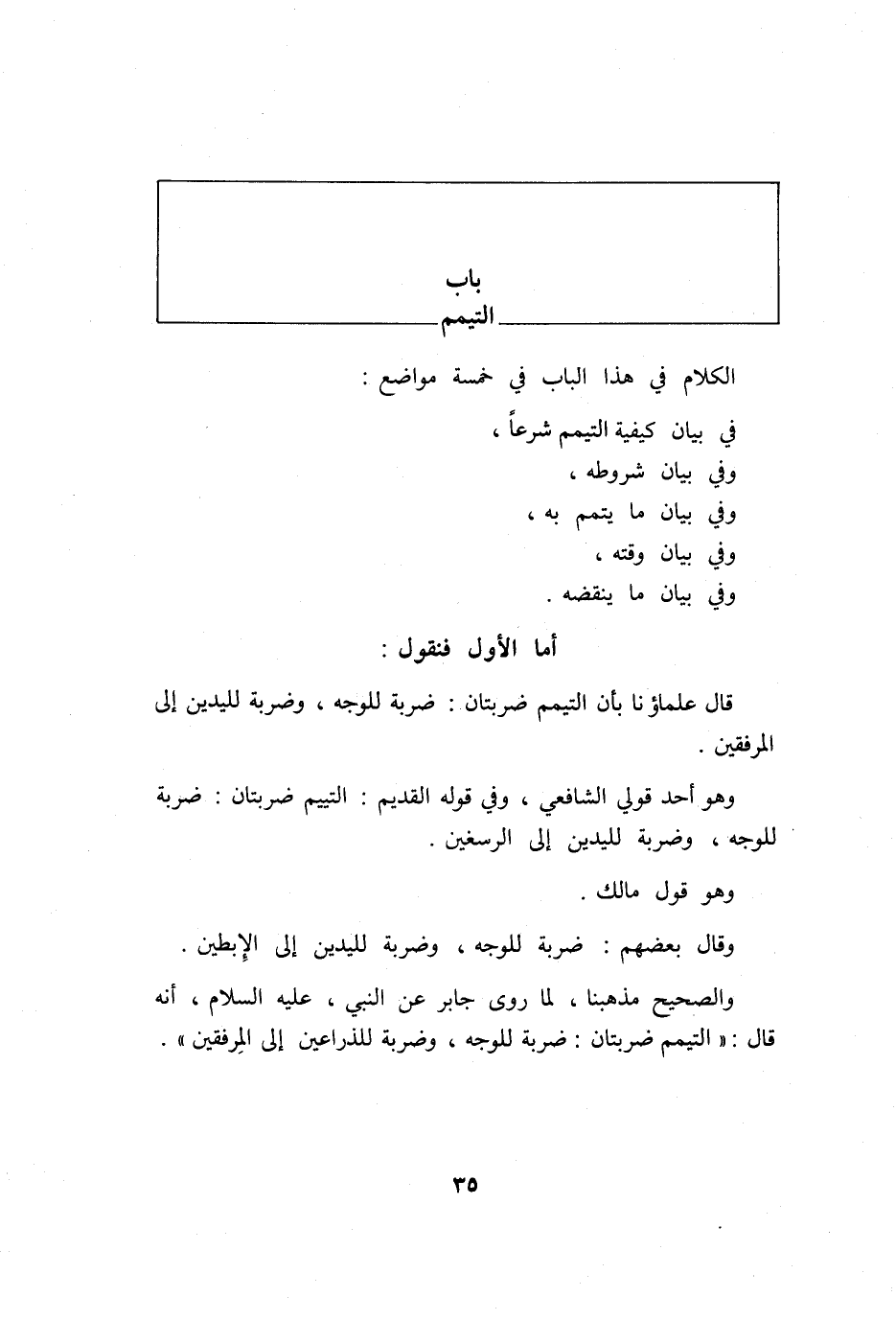الْكَلَام فِي هَذَا الْبَاب فِي خسمة مَوَاضِع فِي بَيَان كَيْفيَّة التَّيَمُّم شرعا وَفِي بَيَان شُرُوطه وَفِي بَيَان مَا يتمم بِهِ وَفِي بَيَان وقته وَفِي بَيَان مَا ينْقضه