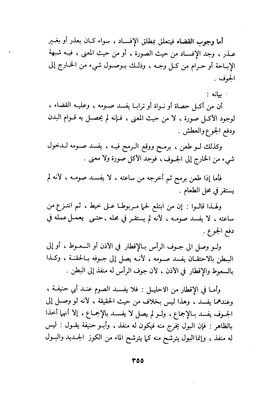 وَأما فِي الإقطار من الإحليل فَلَا يفْسد الصَّوْم عِنْد أبي حنيفَة وَعِنْدَهُمَا يفْسد وَهَذَا لَيْسَ بِخِلَاف من حَيْثُ الْحَقِيقَة لِأَنَّهُ لَو وصل إِلَى الْجوف يفْسد بِالْإِجْمَاع وَلَو لم يصل لَا يفْسد بِالْإِجْمَاع إِلَّا أَنَّهُمَا أخذا بِالظَّاهِرِ فَإِن الْبَوْل يخرج مِنْهُ فَيكون لَهُ منفذ وَأَبُو حنيفَة يَقُول لَيْسَ لَهُ منفذ وَإِنَّمَا الْبَوْل يترشح مِنْهُ كَمَا يترشح المَاء من الْكوز الْجَدِيد وَالْبَوْل
