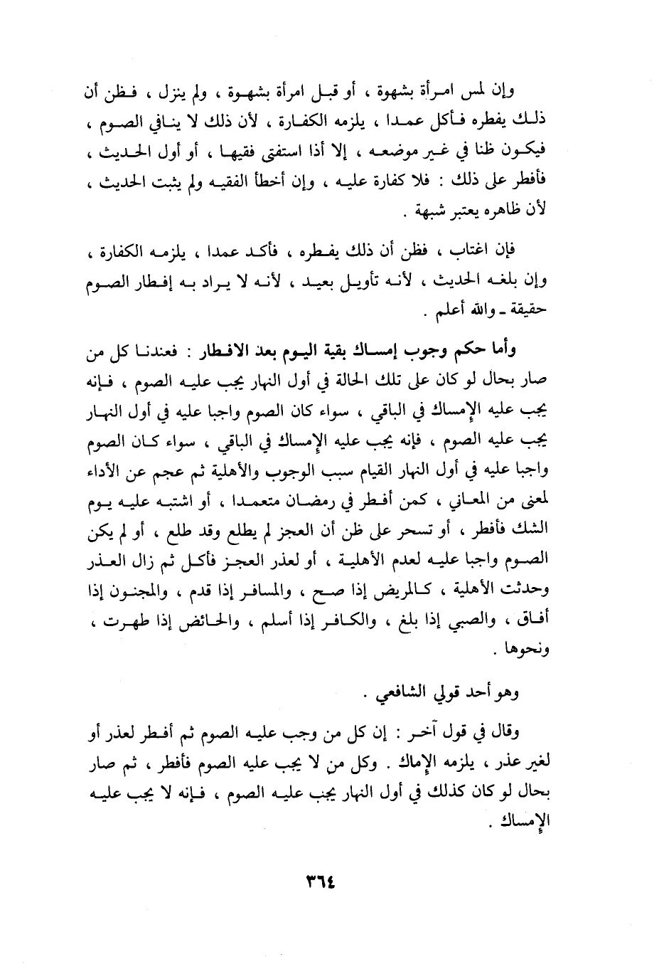 وَإِن لمس امْرَأَة بِشَهْوَة أَو قبل امْرَأَة بِشَهْوَة وَلم ينزل فَظن أَن ذَلِك يفطره فَأكل عمدا يلْزمه الْكَفَّارَة لِأَن ذَلِك لَا يُنَافِي الصَّوْم فَيكون ظنا فِي غير مَوْضِعه إِلَّا إِذا استفتى فَقِيها أَو أول الحَدِيث فَأفْطر على ذَلِك فَلَا كَفَّارَة عَلَيْهِ وَإِن أَخطَأ وَلم يثبت الحَدِيث لِأَن ظَاهره يعْتَبر شُبْهَة