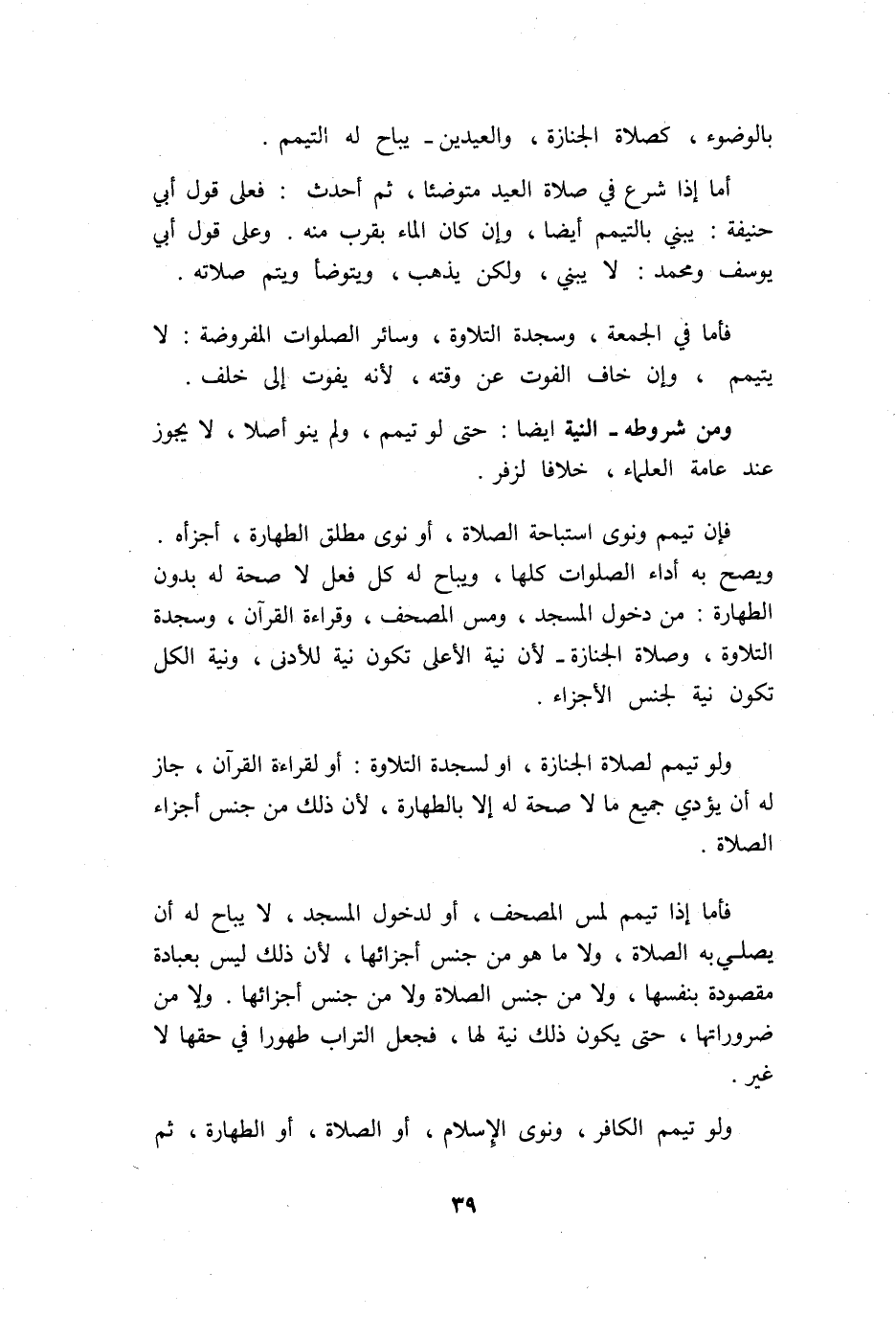 فَأَما إِذا تيَمّم لمس الْمُصحف أَو لدُخُول الْمَسْجِد لَا يُبَاح لَهُ أَن يُصَلِّي بِهِ الصَّلَاة وَلَا مَا هُوَ من جنس أَجْزَائِهَا لِأَن ذَلِك لَيْسَ بِعبَادة مَقْصُودَة بِنَفسِهَا وَلَا من جنس الصَّلَاة وَلَا من جنس أَجْزَائِهَا وَلَا من ضروراتها حَتَّى يكون ذَلِك نِيَّة لَهَا فَجعل التُّرَاب طهُورا فِي حَقّهَا لَا غير