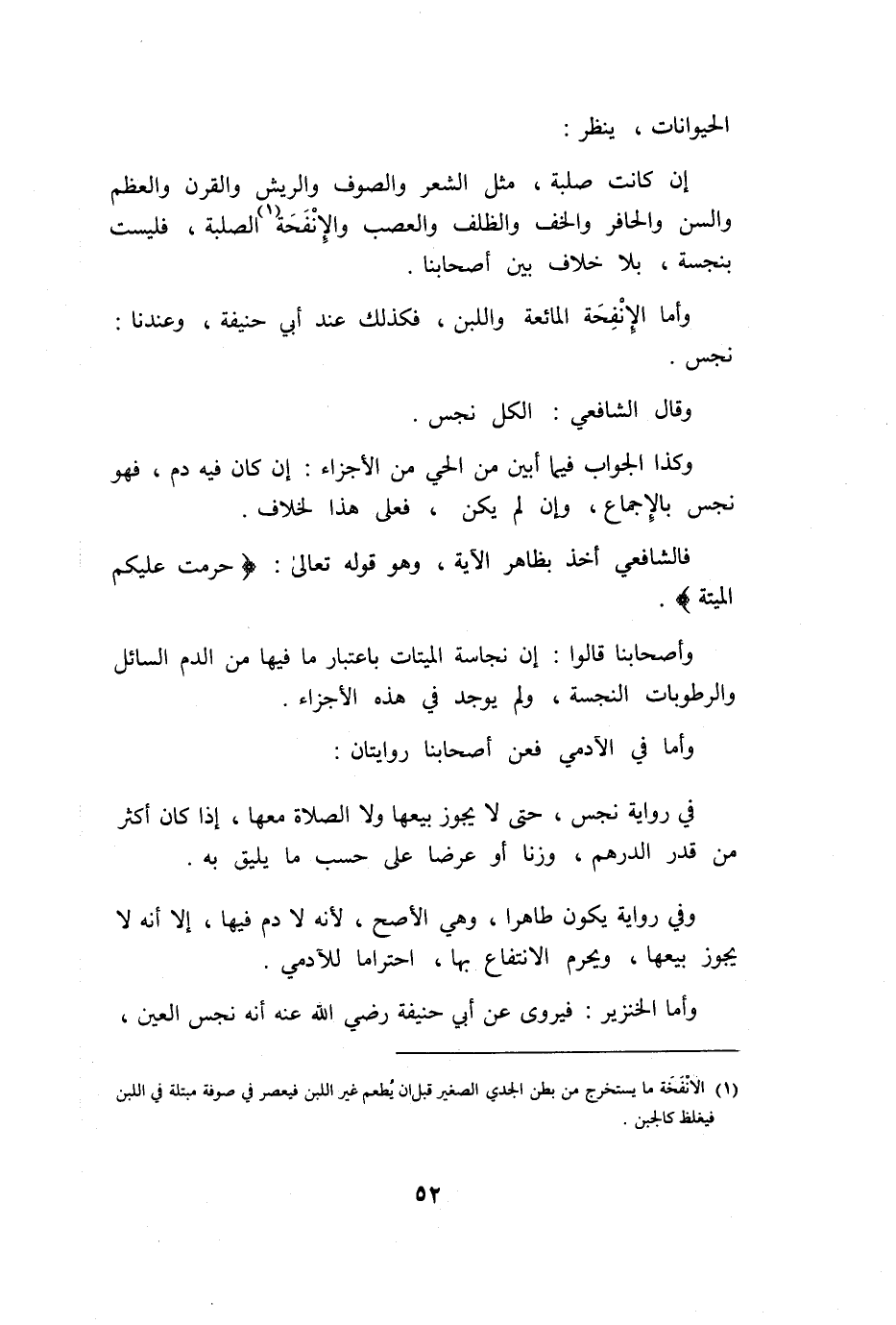 الْحَيَوَانَات ينظر إِن كَانَت صلبة مثل الشّعْر وَالصُّوف والريش والقرن والعظم وَالسّن والحافر والخف والظلف والعصب والإنفحة الصلبة فَلَيْسَتْ بنجسة بِلَا خلاف بَين أَصْحَابنَا