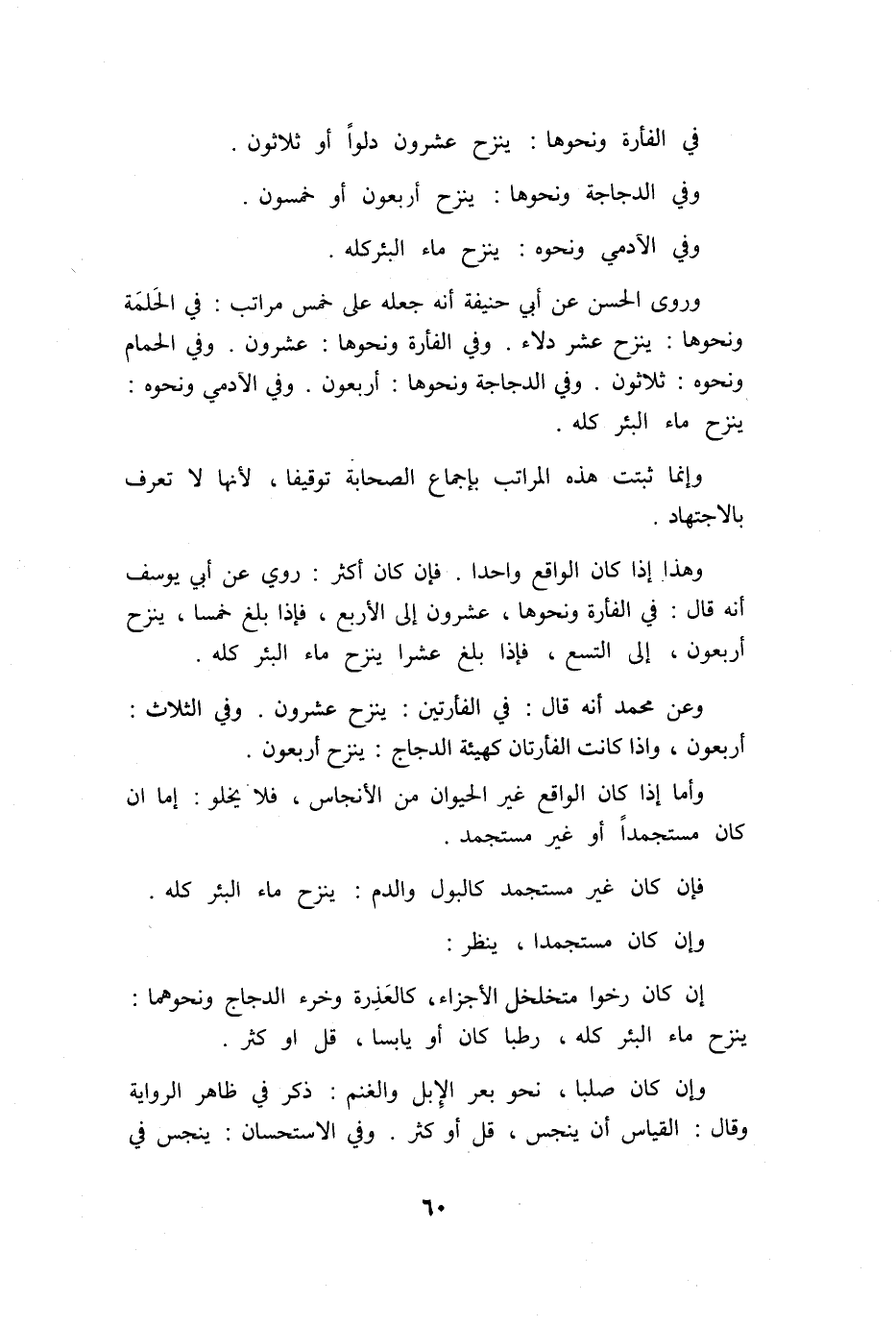 وروى الْحسن عَن أبي حنيفَة أَنه جعله على خمس مَرَاتِب فِي الحلمة وَنَحْوهَا ينْزح عشر دلاء