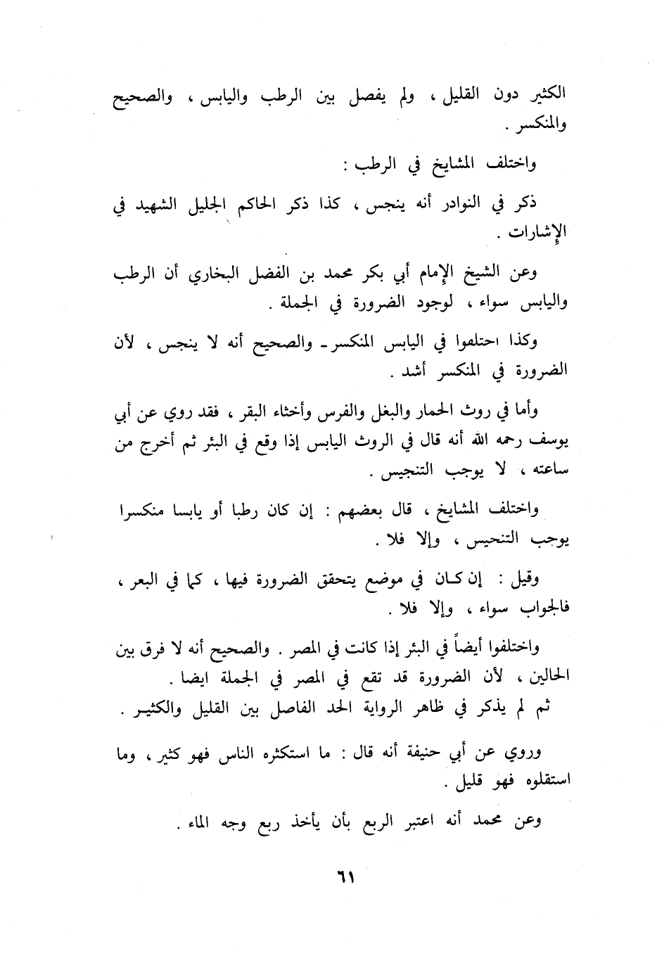 وَعَن الشَّيْخ الإِمَام أبي بكر مُحَمَّد بن الْفضل البُخَارِيّ أَن الرطب واليابس سَوَاء لوُجُود الضَّرُورَة فِي الْجُمْلَة