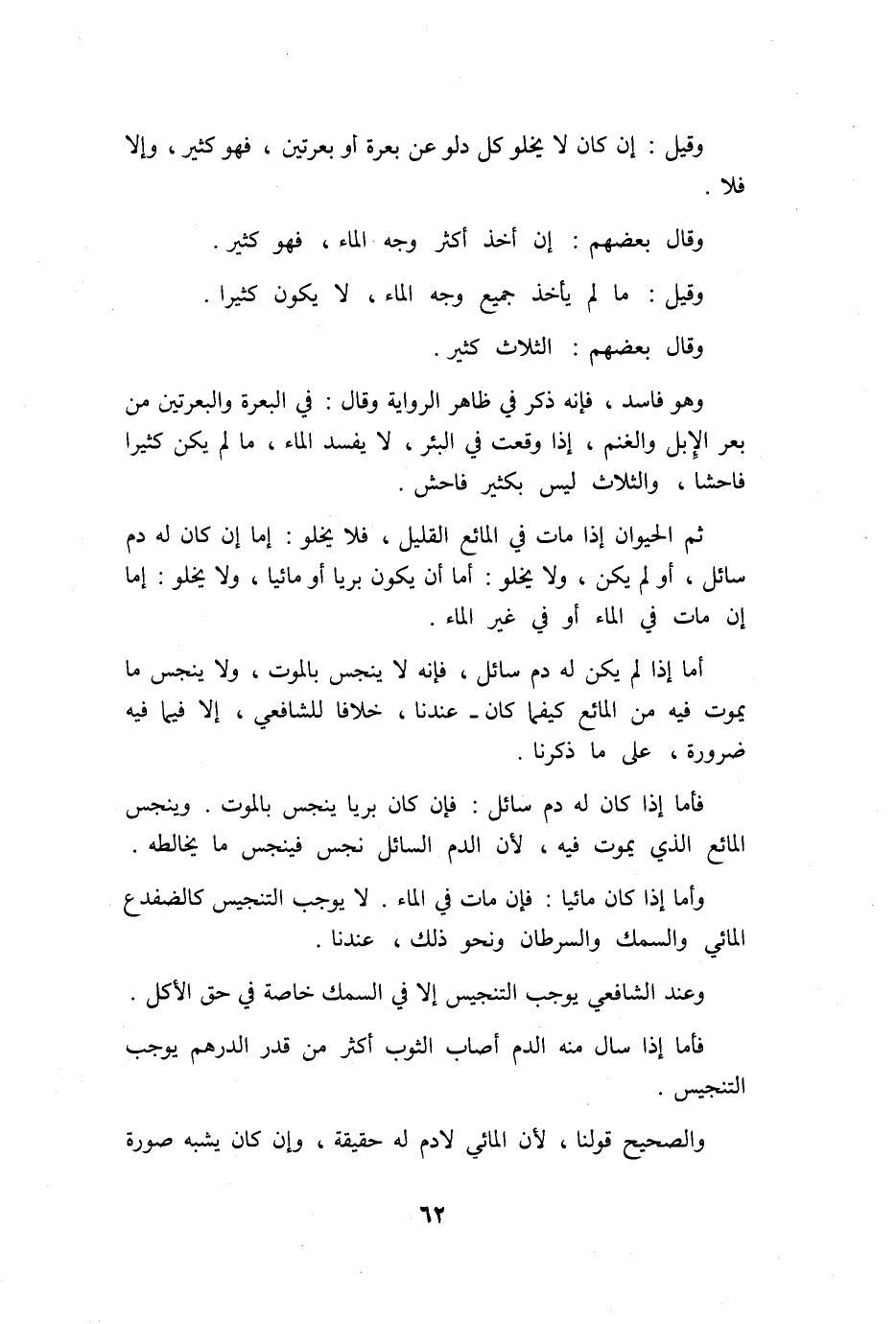 ثمَّ الْحَيَوَان إِذا مَاتَ فِي الْمَائِع الْقَلِيل فَلَا يَخْلُو إِمَّا إِن كَانَ لَهُ دم سَائل أَو لم يكن وَلَا يَخْلُو إِمَّا أَن يكون بريا أَو مائيا وَلَا يَخْلُو إِمَّا إِن مَاتَ فِي المَاء أَو فِي غير المَاء